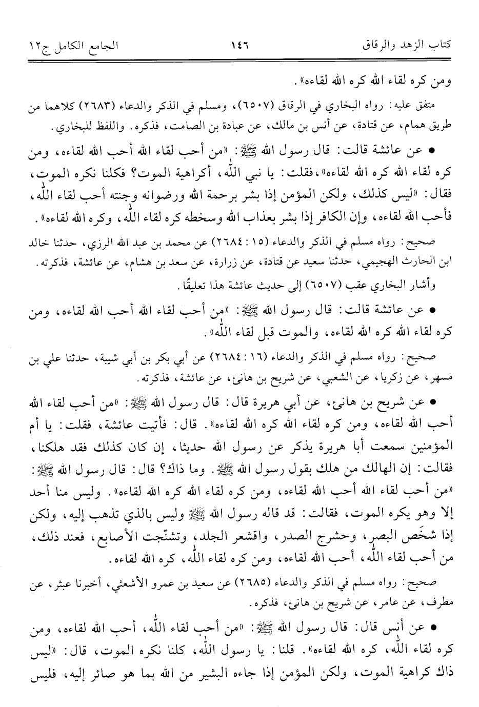 • عن شريح بن هانئ، عن أبي هريرة قال: قال رسول اللَّه -صلى اللَّه عليه وسلم-: "من أحب لقاء اللَّه أحب اللَّه لقاءه، ومن كره لقاء اللَّه كره اللَّه لقاءه". قال: فأتيت عائشة، فقلت: يا أم المؤمنين سمعت أبا هريرة يذكر عن رسول اللَّه حديثا، إن كان كذلك فقد هلكنا، فقالت: إن الهالك من هلك بقول رسول اللَّه -صلى اللَّه عليه وسلم-. وما ذاك؟ قال: قال رسول اللَّه -صلى اللَّه عليه وسلم-: "من أحب لقاء اللَّه أحب اللَّه لقاءه، ومن كره لقاء اللَّه كره اللَّه لقاءه". وليس منا أحد إلا وهو يكره الموت، فقالت: قد قاله رسول اللَّه -صلى اللَّه عليه وسلم- وليس بالذي تذهب إليه، ولكن إذا شخَص البصر، وحشرج الصدر، واقشعر الجلد، وتشنّجت الأصابع، فعند ذلك، من أحب لقاء اللَّه، أحب اللَّه لقاءه، ومن كره لقاء اللَّه، كره اللَّه لقاءه.
