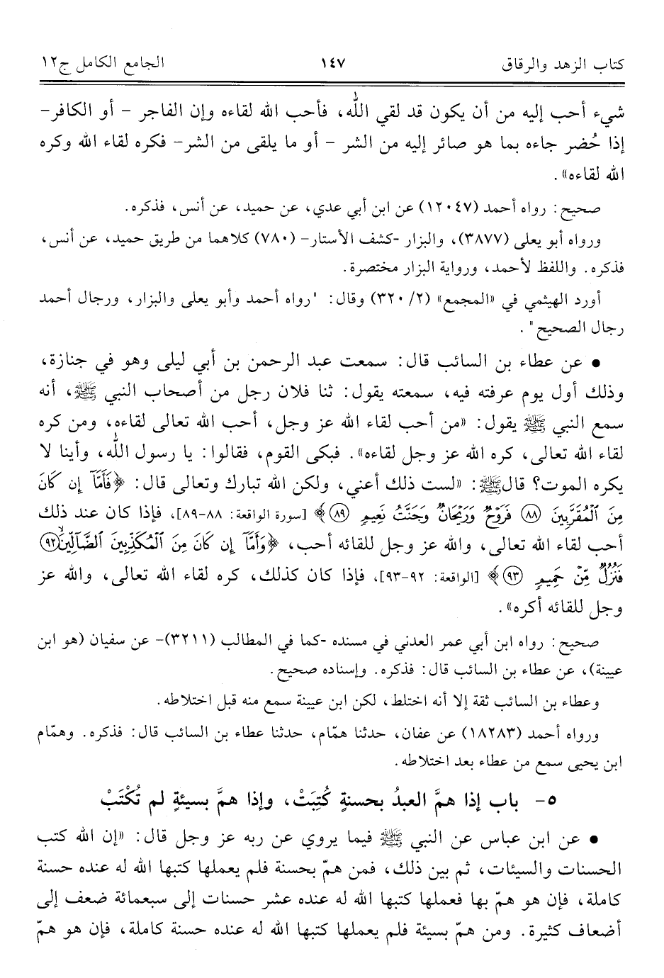 • عن عطاء بن السائب قال: سمعت عبد الرحمن بن أبي ليلى وهو في جنازة، وذلك أول يوم عرفته فيه، سمعته يقول: ثنا فلان رجل من أصحاب النبي -صلى اللَّه عليه وسلم-، أنه سمع النبي -صلى اللَّه عليه وسلم- يقول: "من أحب لقاء اللَّه عز وجل، أحب اللَّه تعالى لقاءه، ومن كره لقاء اللَّه تعالى، كره اللَّه عز وجل لقاءه". فبكى القوم، فقالوا: يا رسول اللَّه، وأينا لا يكره الموت؟ قال -صلى اللَّه عليه وسلم-: "لست ذلك أعني، ولكن اللَّه تبارك وتعالى قال: {فَأَمَّا إِنْ كَانَ مِنَ الْمُقَرَّبِينَ (٨٨) فَرَوْحٌ وَرَيْحَانٌ وَجَنَّتُ نَعِيمٍ (٨٩)} [سورة الواقعة: ٨٨ - ٨٩]، فإذا كان عند ذلك أحب لقاء اللَّه تعالى، واللَّه عز وجل للقائه أحب، {وَأَمَّا إِنْ كَانَ مِنَ الْمُكَذِّبِينَ الضَّالِّينَ (٩٢) فَنُزُلٌ مِنْ حَمِيمٍ (٩٣)} [الواقعة: ٩٢ - ٩٣]، فإذا كان كذلك، كره لقاء اللَّه تعالى، واللَّه عز وجل للقائه أكره".