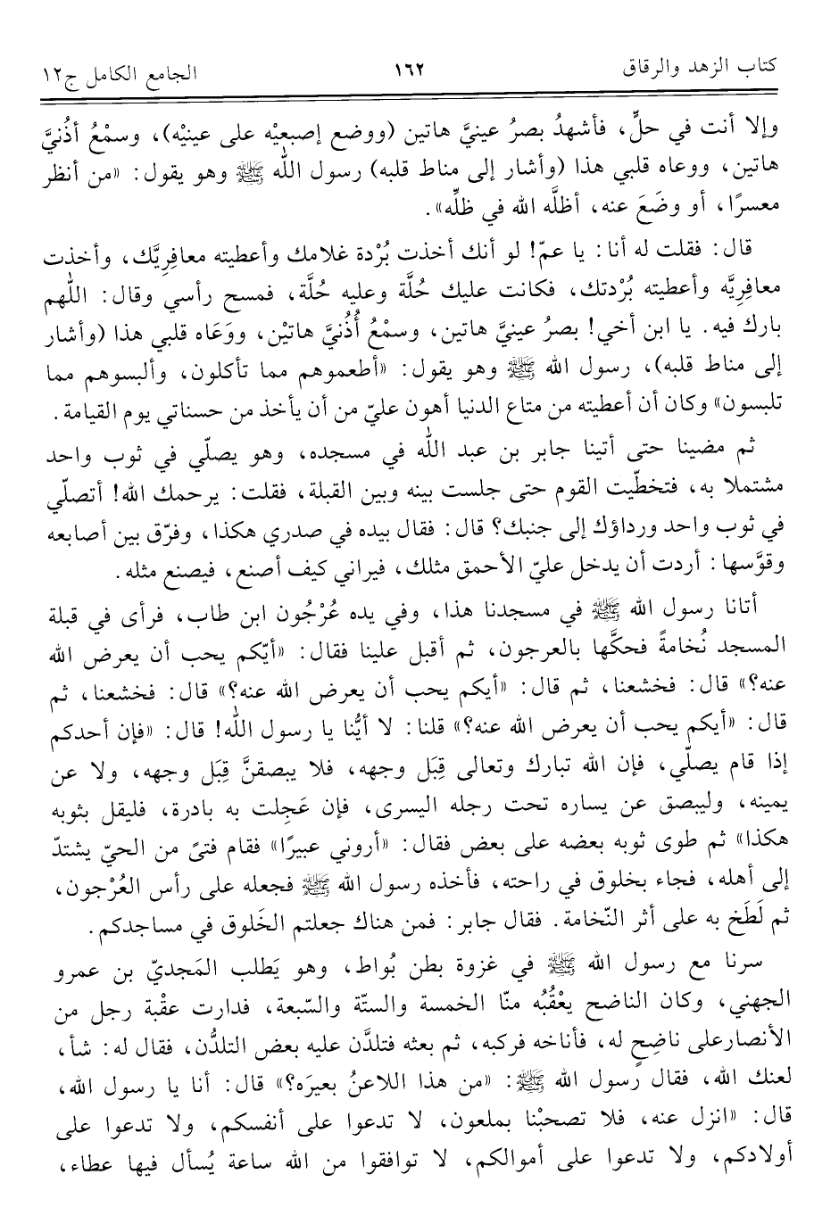 ثم مضينا حتى أتينا جابر بن عبد اللَّه في مسجده، وهو يصلّي في ثوب واحد مشتملا به، فتخطّيت القوم حتى جلست بينه وبين القبلة، فقلت: يرحمك اللَّه! أتصلّي في ثوب واحد ورداؤك إلى جنبك؟ قال: فقال بيده في صدري هكذا، وفرّق بين أصابعه وقوَّسها: أردت أن يدخل عليّ الأحمق مثلك، فيراني كيف أصنع، فيصنع مثله.