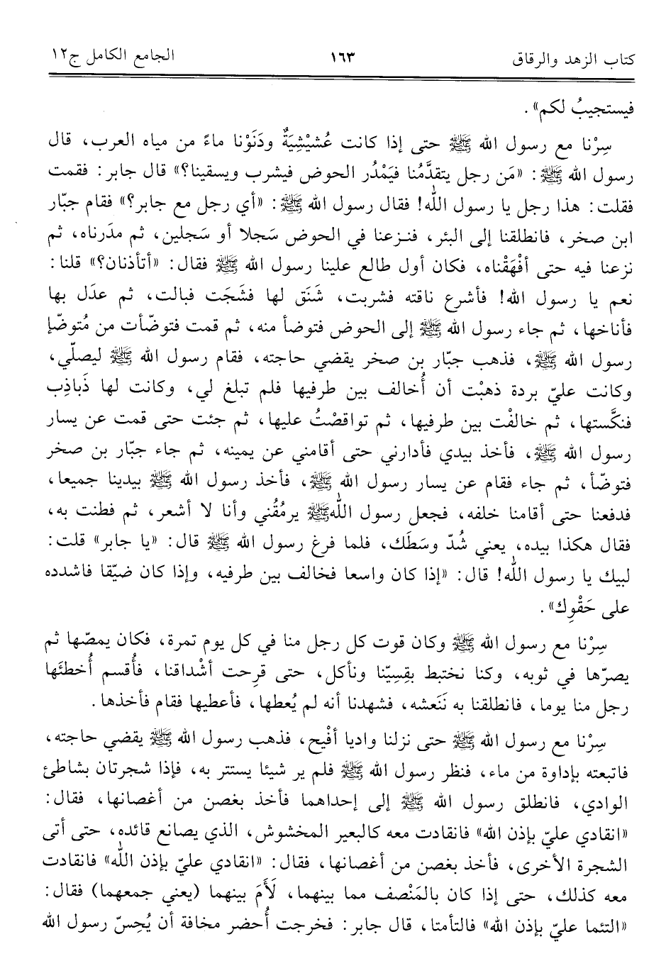 سِرْنا مع رسول اللَّه -صلى اللَّه عليه وسلم- حتى إذا كانت عُشيْشِيَةٌ ودَنَوْنا ماءً من مياه العرب، قال رسول اللَّه -صلى اللَّه عليه وسلم-: "مَن رجل يتقدَّمُنا فيَمْدُر الحوض فيشرب ويسقينا؟ " قال جابر: فقمت فقلتْ هذا رجل يا رسول اللَّه! فقال رسول اللَّه -صلى اللَّه عليه وسلم-: "أي رجل مع جابر؟ " فقام جبّار ابن صخر، فانطلقنا إلى البئر، فنزعنا في الحوض سَجلا أو سَجلين، ثم مدَرناه، ثم نزعنا فيه حتى أفْهَقْناه، فكان أول طالع علينا رسول اللَّه -صلى اللَّه عليه وسلم- فقال: "أتأذنان؟ " قلنا: نعم يا رسول اللَّه! فأشرع ناقته فشربت، شَنَق لها فشَجَت فبالت، ثم عدَل بها فأناخها، ثم جاء رسول اللَّه -صلى اللَّه عليه وسلم- إلى الحوض فتوضأ منه، ثم قمت فتوضّأت من مُتوضّإ رسول اللَّه -صلى اللَّه عليه وسلم-، فذهب جبّار بن صخر يقضي حاجته، فقام رسول اللَّه -صلى اللَّه عليه وسلم- ليصلّي، وكانت عليّ بردة ذهبْت أن أُخالف بين طرفيها فلم تبلغ لي، وكانت لها ذَباذِب فنكَّستها، ثم خالفْت بين طرفيها، ثم تواقصْتُ عليها، ثم جئت حتى قمت عن يسار رسول اللَّه -صلى اللَّه عليه وسلم-، فأخذ بيدي فأدارني حتى أقامني عن يمينه، ثم جاء جبّار بن صخر فتوضّأ، ثم جاء فقام عن يسار رسول اللَّه -صلى اللَّه عليه وسلم-، فأخذ رسول اللَّه -صلى اللَّه عليه وسلم- بيدينا جميعا، فدفعنا حتى أقامنا خلفه، فجعل رسول اللَّه -صلى اللَّه عليه وسلم- يرمُقُني وأنا لا أشعر، ثم فطنت به، فقال هكذا بيده، يعني شُدّ وسَطَك، فلما فرغ رسول اللَّه -صلى اللَّه عليه وسلم- قال: "يا جابر" قلت: لبيك يا رسول اللَّه! قال: "إذا كان واسعا فخالف بين طرفيه، وإذا كان ضيّقا فاشدده على حَقْوِك".