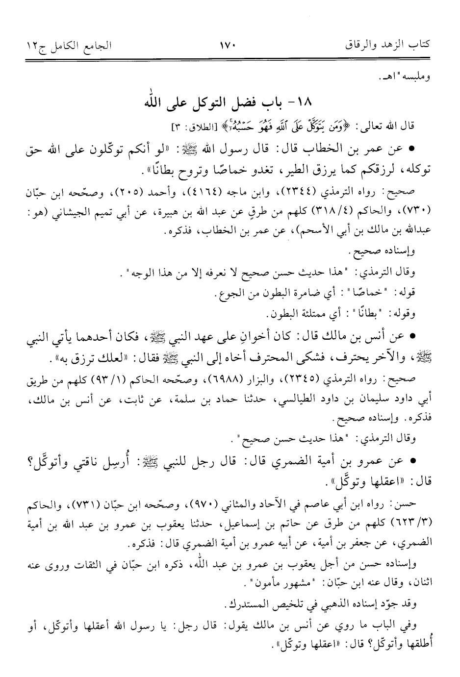 • عن عمر بن الخطاب قال: قال رسول اللَّه -صلى اللَّه عليه وسلم-: "لو أنكم توكّلون على اللَّه حق توكله، لرزقكم كما يرزق الطير، تغدو خماصًا وتروح بطانًا".