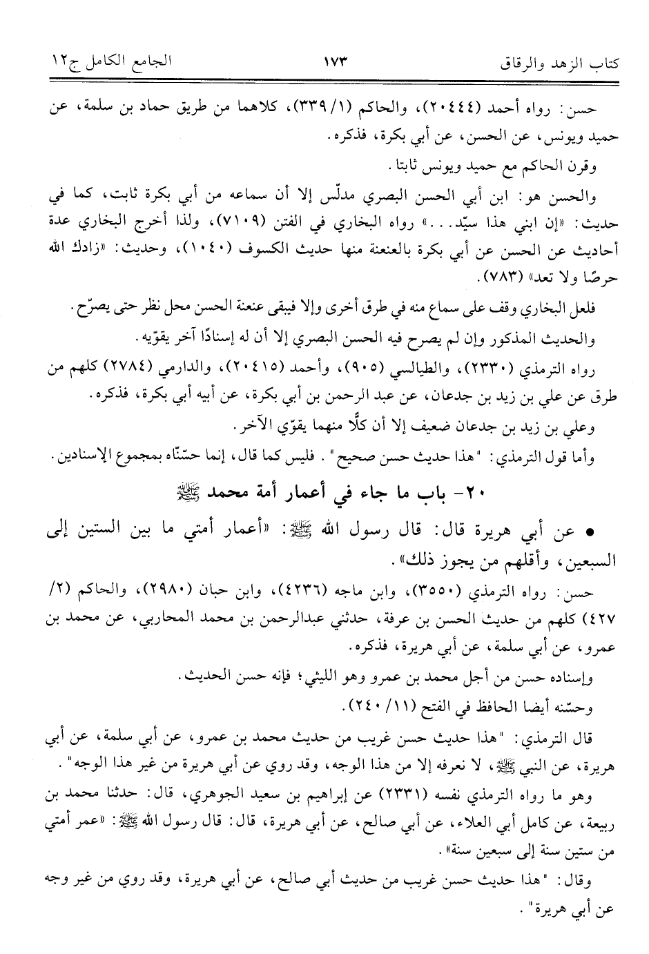 وهو ما رواه الترمذيّ نفسه (٢٣٣١) عن إبراهيم بن سعيد الجوهري، قال: حدّثنا محمد بن ربيعة، عن كامل أبي العلاء، عن أبي صالح، عن أبي هريرة، قال: قال رسول اللَّه -صلى اللَّه عليه وسلم-: "عمر أمتي من ستين سنة إلى سبعين سنة".