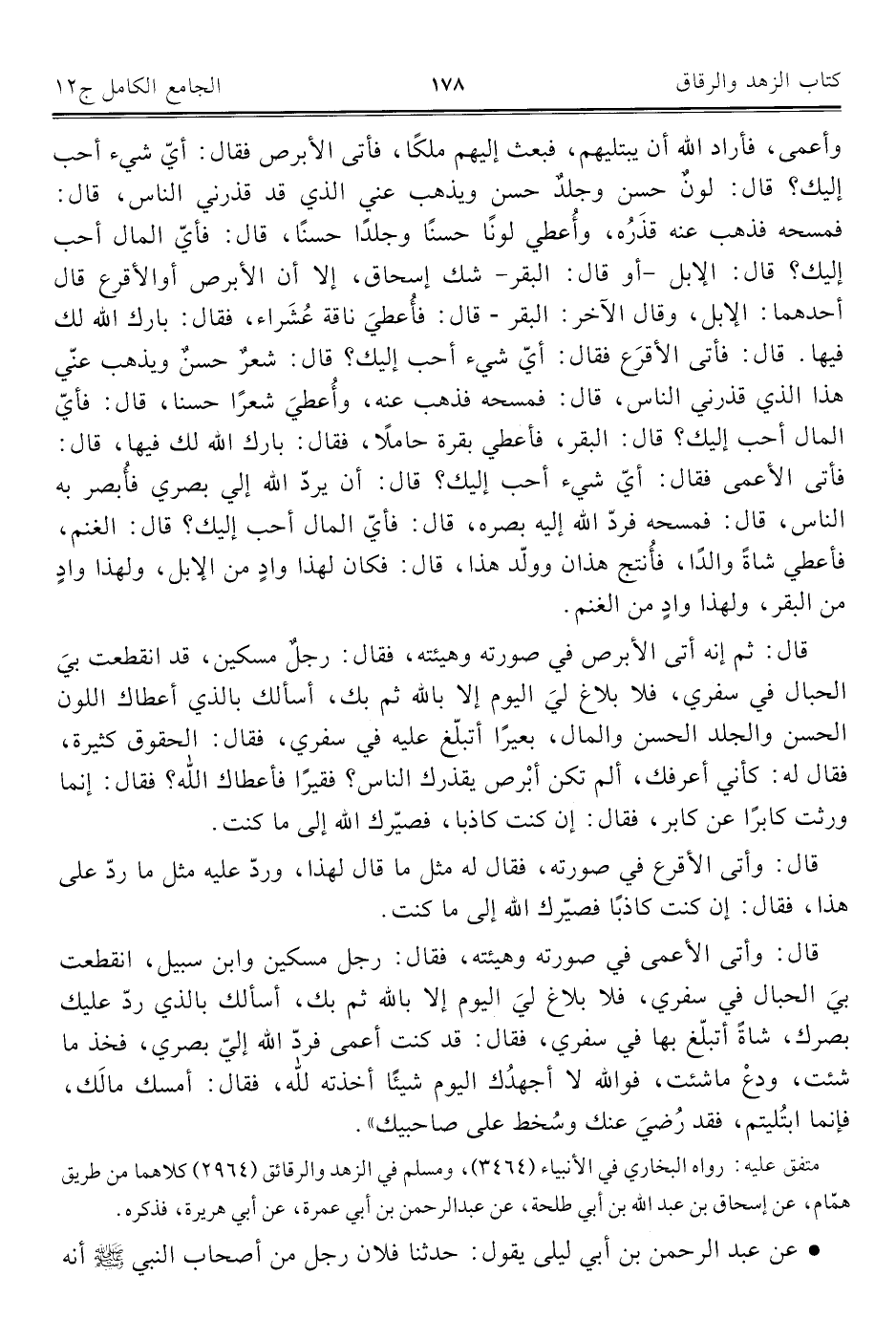 وأعمى، فأراد اللَّه أن يبتليهم، فبعث إليهم ملكًا، فأتى الأبرص فقال: أيّ شيء أحب إليك؟ قال: لونٌ حسن وجلدٌ حسن ويذهب عني الذي قد قذرني الناس، قال: فمسحه فذهب عنه قذَرُه، وأُعطي لونًا حسنًا وجلدًا حسنًا، قال: فأيّ المال أحب إليك؟ قال: الإبل -أو قال: البقر- شك إسحاق، إلا أن الأبرص أو الأقرع قال أحدهما: الإبل، وقال الآخر: البقر - قال: فأُعطيَ ناقة عُشَراء، فقال: بارك اللَّه لك فيها. قال: فأتى الأقرَع فقال: أيّ شيء أحب إليك؟ قال: شعرٌ حسنٌ ويذهب عنّي هذا الذي قذرني الناس، قال: فمسحه فذهب عنه، وأُعطيَ شعرًا حسنا، قال: فأيّ المال أحب إليك؟ قال: البقر، فأعطي بقرة حاملًا، فقال: بارك اللَّه لك فيها، قال: فأتى الأعمى فقال: أيّ شيء أحب إليك؟ قال: أن يردّ اللَّه إلي بصري فأُبصر به الناس، قال: فمسحه فردّ اللَّه إليه بصره، قال: فأيّ المال أحب إليك؟ قال: الغنم، فأعطي شماةً والدًا، فأُنتج هذان وولّد هذا، قال: فكان لهذا وادٍ من الإبل، ولهذا وادٍ من البقر، ولهذا وادٍ من الغنم.