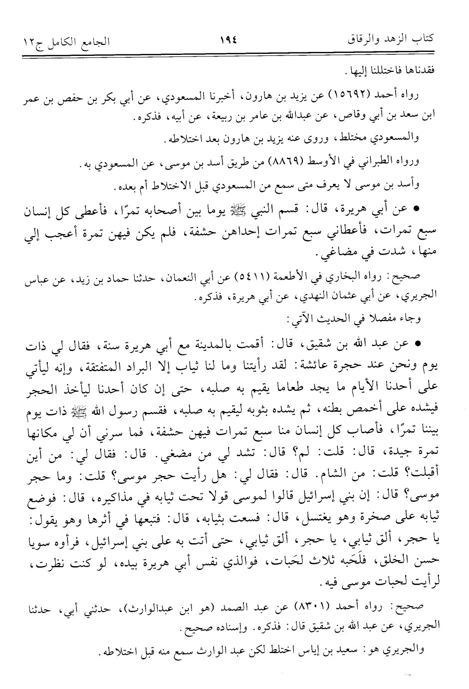 • عن عبد اللَّه بن شقيق، قال: أقصت بالمدينة مع أبي هريرة سنة، فقال لي ذات يوم ونحن عند حجرة عائشة: لقد رأيتنا وما لنا ثياب إلا البراد المتفتقة، وإنه ليأتي على أحدنا الأيام ما يجد طعاما يقيم به صلبه، حتى إن كان أحدنا ليأخذ الحجر فيشده على أخمص بطنه، ثم يشده بثوبه ليقيم به صلبه، فقسم رسول اللَّه -صلى اللَّه عليه وسلم- ذات يوم بيننا تمرًا، فأصاب كل إنسان منا سبع تمرات فيهن حشفة، فما سرني أن لي مكانها تمرة جيدة، قال: قلت: لم؟ قال: تشد لي من مضغي. قال: فقال لي: من أين أقبلت؟ قلت: من المنمام. قال: فقال لي: هل رأيت حجر موسى؟ قلت: وما حجر موسى؟ قال: إن بني إسرائيل قالوا لموسى قولا تحت ثيابه في مذاكيره، قال: فوضع ثيابه على صخرة وهو يغتسل، قال: فسعت بثيابه، قال: فتبعها في أثرها وهو يقول: يا حجر، ألق ثيابي، يا حجر، ألق ثيابي، حتى أتت به على بني إسرائيل، فرأوه سويا حسن الخلق، فلَحَبه ثلاث لحَبات، فوالذي نفس أبي هريرة بيده، لو كنت نظرت، لرأيت لحبات موسى فيه.
