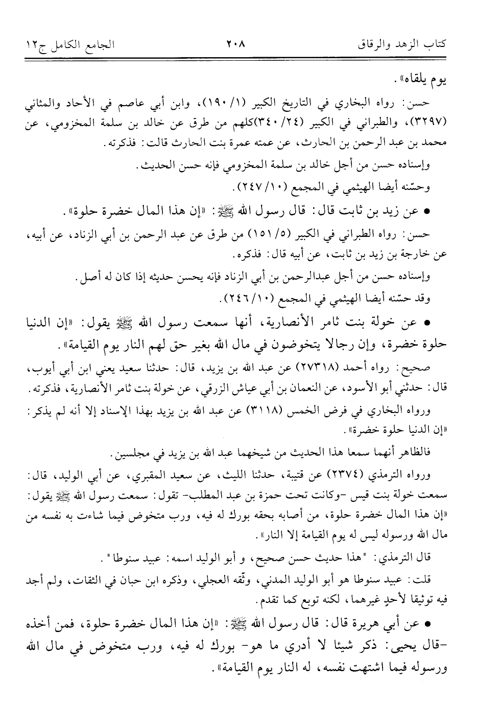 • عن زيد بن ثابت قال: قال رسول اللَّه -صلى اللَّه عليه وسلم-: "إن هذا المال خضرة حلوة".