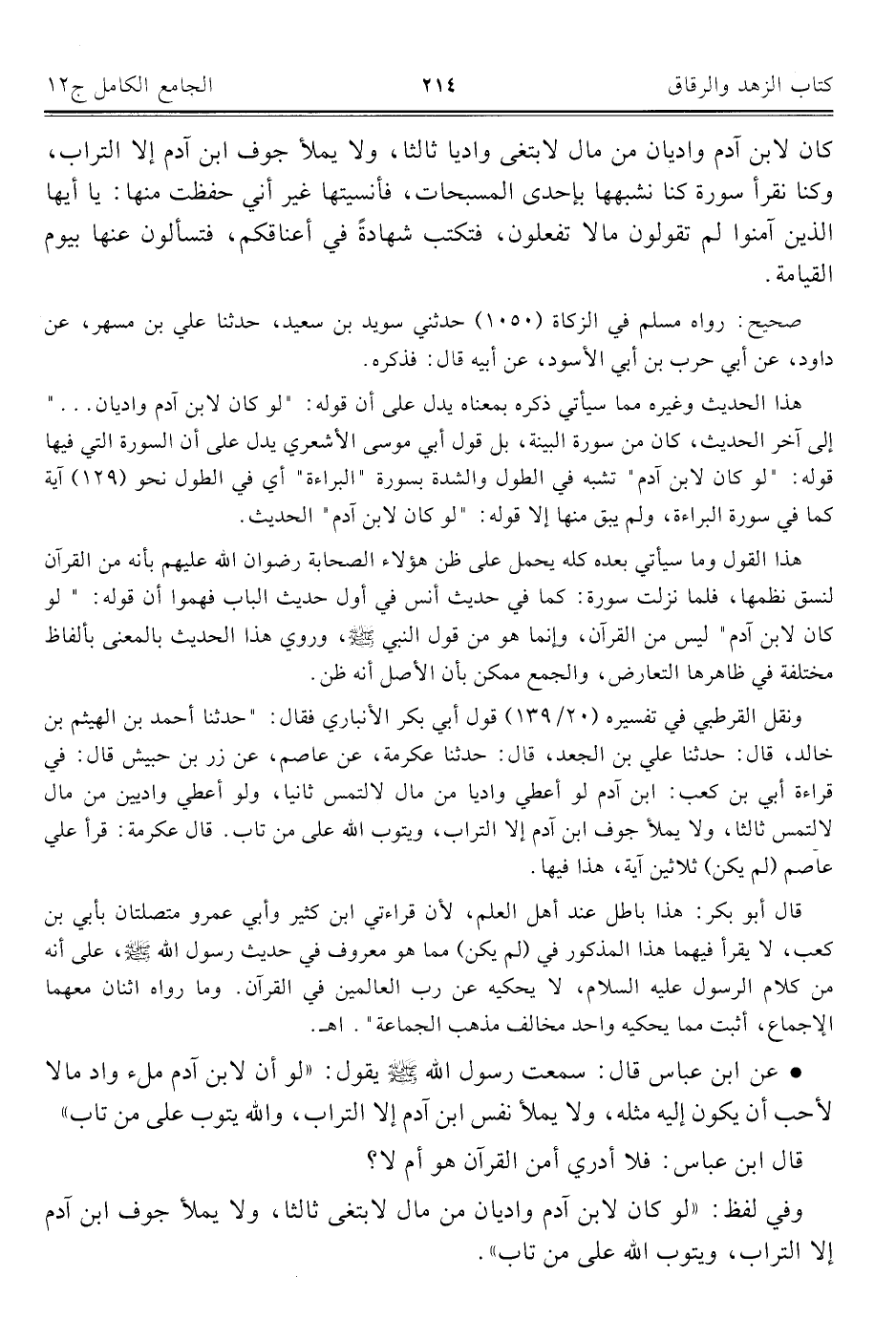 كان لابن آدم واديان من مال لابتغى واديا ثالثا، ولا يملأ جوف ابن آدم إلا التراب، وكنا نقرأ سورة كنا نشبهها بإحدى المسبحات، فأنسيتها غير أني حفظت منها: يا أيها الذين آمنوا لم تقولون مالا تفعلون، فتكتب شهادةً في أعناقكم، فتسألون عنها بيوم القيامة.