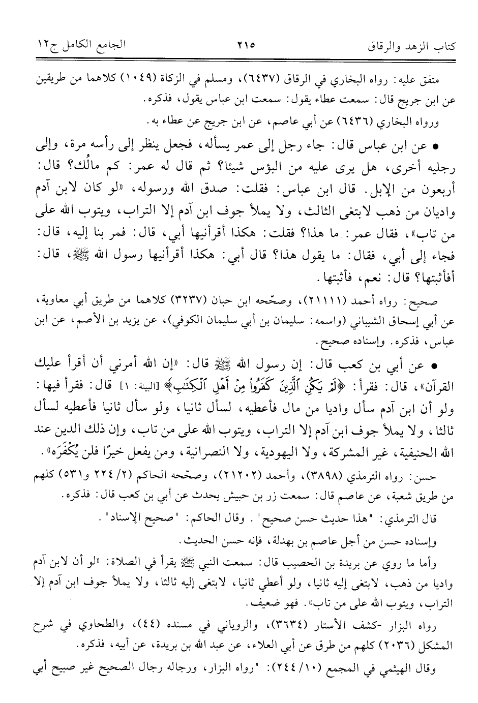 وأما ما روي عن بريدة بن الحصيب قال: سمعت النبي -صلى اللَّه عليه وسلم- يقرأ في الصلاة: "لو أن لابن آدم واديا من ذهب، لابتغى إليه ثانيا، ولو أعطي ثانيا، لابتغى إليه ثالثا، ولا يملأ جوف ابن آدم إلا التراب، ويتوب اللَّه على من تاب". فهو ضعيف.