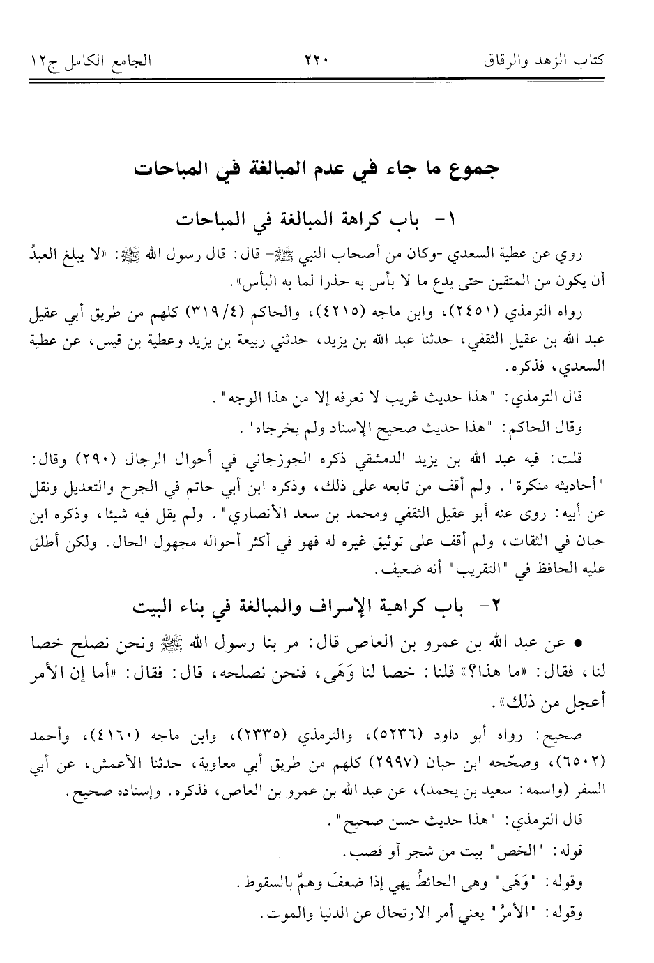 ٢ - باب كراهية الاسراف والمبالغة في بناء البيت
