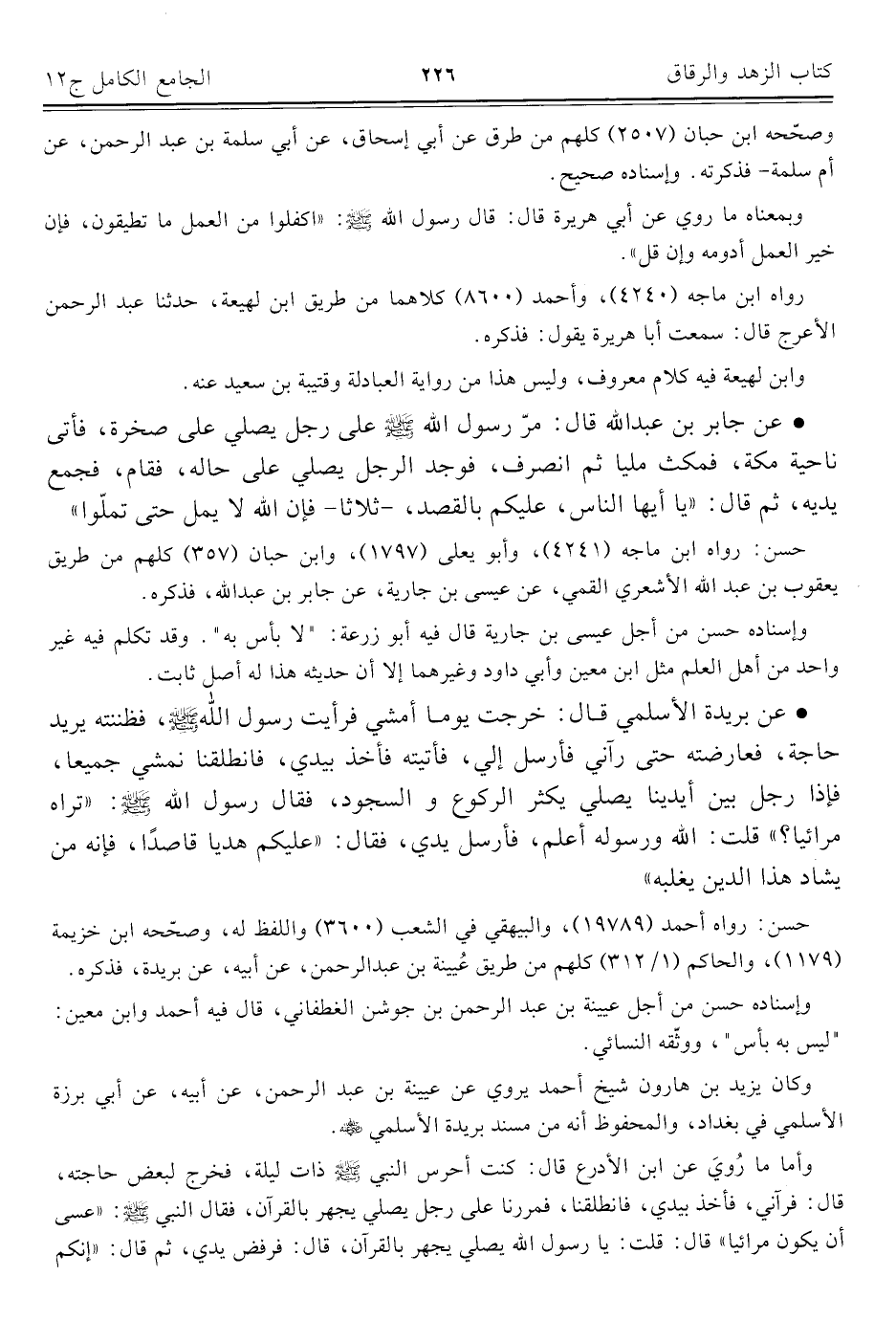 • عن جابر بن عبد اللَّه قال: مرّ رسول اللَّه -صلى اللَّه عليه وسلم- على رجل يصلي على صخرة، فأتى ناحية مكة، فمكث مليا ثم انصرف، فوجد الرجل يصلي على حاله، فقام، فجمع يديه، ثم قال: "يا أيها الناس، عليكم بالقصد، -ثلاثا- فإن اللَّه لا يمل حتى تملّوا"