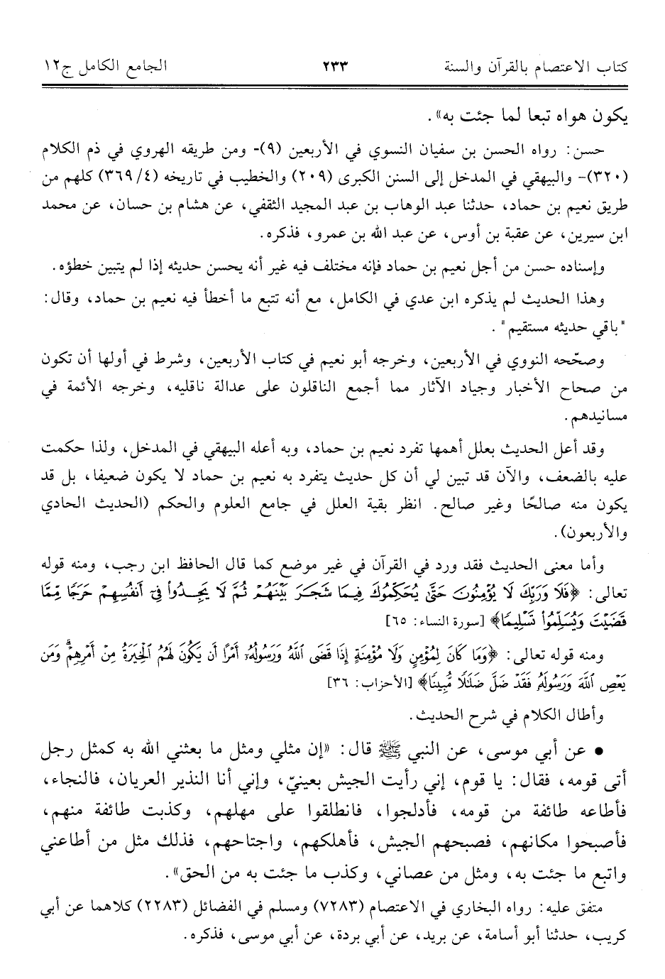 وأما معنى الحديث فقد ورد في القرآن في غير موضع كما قال الحافظ ابن رجب، ومنه قوله تعالى: {فَلَا وَرَبِّكَ لَا يُؤْمِنُونَ حَتَّى يُحَكِّمُوكَ فِيمَا شَجَرَ بَيْنَهُمْ ثُمَّ لَا يَجِدُوا فِي أَنْفُسِهِمْ حَرَجًا مِمَّا قَضَيْتَ وَيُسَلِّمُوا تَسْلِيمًا} [سورة النساء: ٦٥]