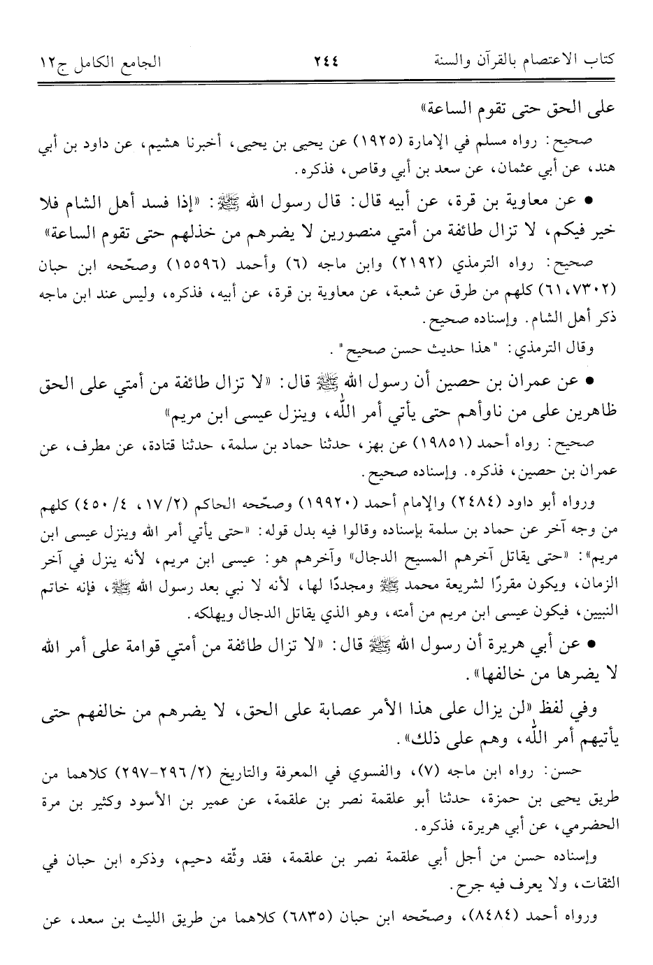 • عن عمران بن حصين أن رسول اللَّه -صلى اللَّه عليه وسلم- قال: "لا تزال طائفة من أمتي على الحق ظاهرين على من ناوأهم حتى يأتي أمر اللَّه، وينزل عيسى ابن مريم"