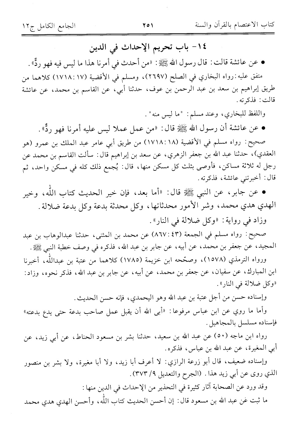 • عن عائشة قالت: قال رسول اللَّه -صلى اللَّه عليه وسلم-: "من أحدث في أمرنا هذا ما ليس فيه فهو ردٌّ".