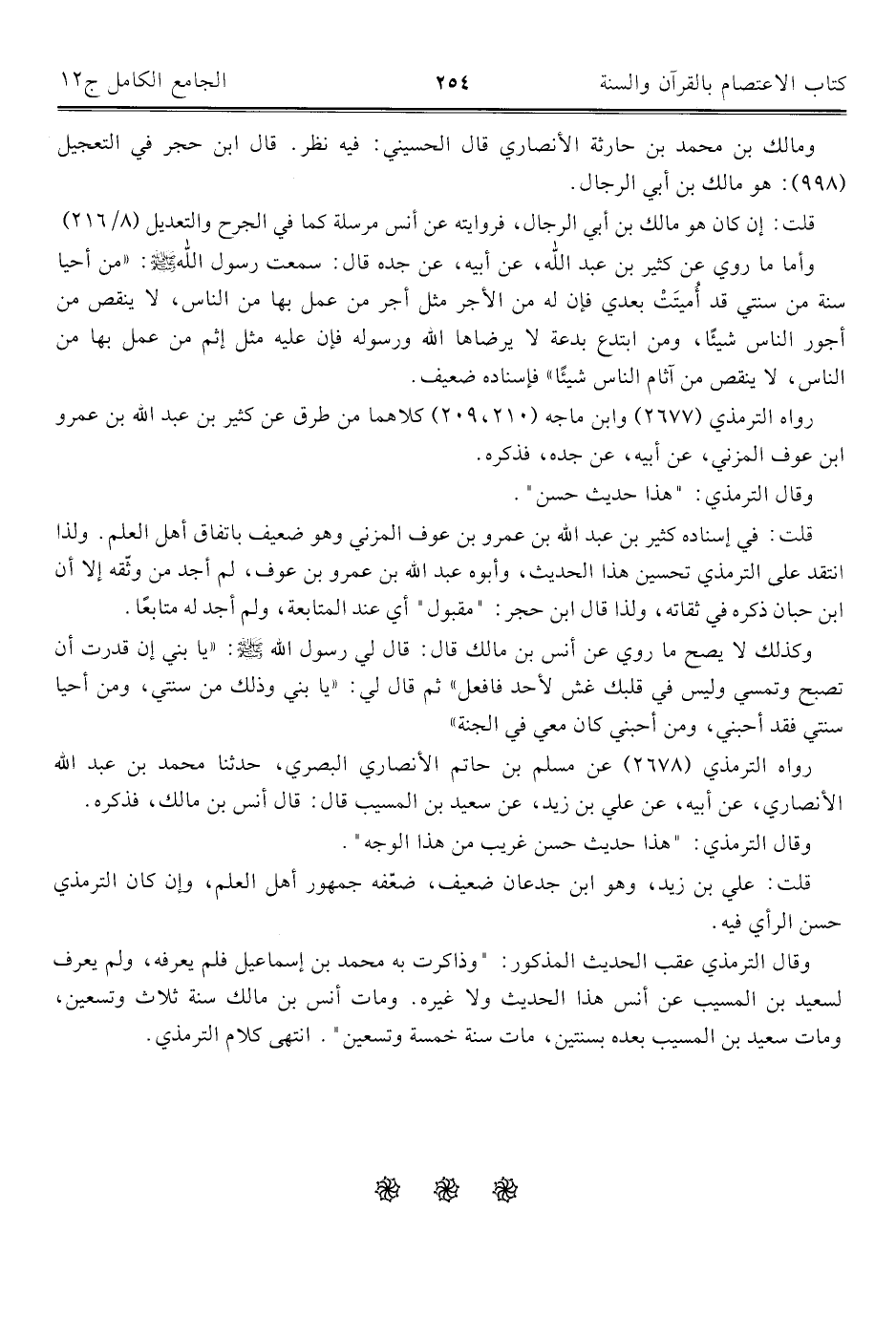 قلت: إن كان هو مالك بن أبي الرجال، فروايته عن أنس مرسلة كما في الجرح والتعديل (٨/ ٢١٦) وأما ما روي عن كثير بن عبد اللَّه، عن أبيه، عن جده قال: سمعت رسول اللَّه -صلى اللَّه عليه وسلم-: "من أحيا سنة من سنتي قد أُميتَتْ بعدي فإن له من الأجر مثل أجر من عمل بها من الناس، لا ينقص من أجور الناس شيئًا، ومن ابتدع بدعة لا يرضاها اللَّه ورسوله فإن عليه مثل إثم من عمل بها من الناس، لا ينقص من آثام الناس شيئًا" فإسناده ضعيف.