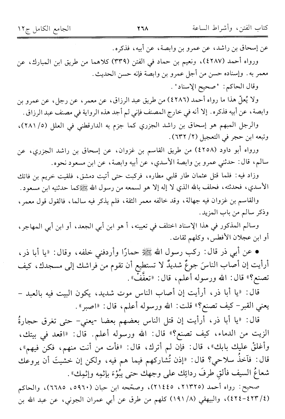 قال: "يا أبا ذر، أرأيت إن قتل الناس بعضهم بعضا -يعني- حتى تغرق حجارةُ الزيت من الدماء، كيف تصنع؟ " قال: اللَّه ورسوله أعلم. قال: "اقعد في بيتك، وأغلقْ عليك بابك"، قال: فإن لم أترك، قال: "فأت من أنت منهم، فكن فيهم"، قال: فآخذُ سلاحي؟ قال: "إذن تُشاركهم فيما هم فيه، ولكن إن خشيتَ أن يروعك شعاعُ السيف فألقِ طرفَ ردائِك على وجهك حتى يبُوْءَ بإثمِه وإثمِك".