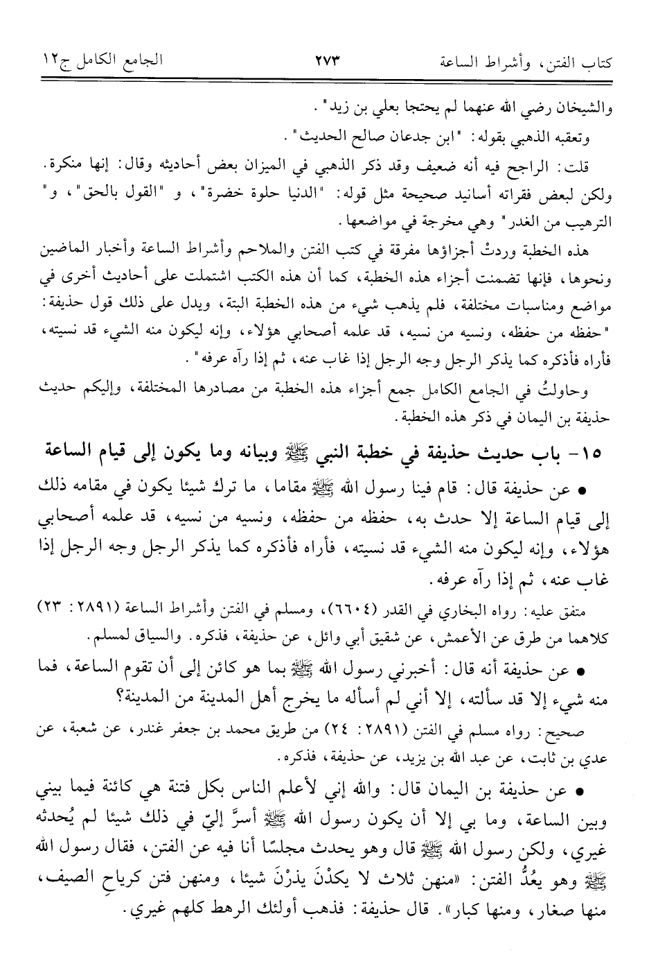 وحاولتُ في الجامع الكامل جمع أجزاء هذه الخطبة من مصادرها المختلفة، وإليكم حديث حذيفة بن اليمان في ذكر هذه الخطبة.