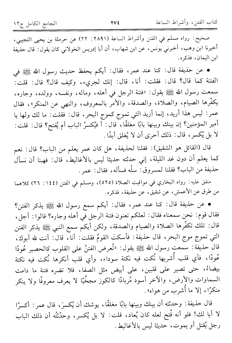 • عن حذيفة قال: كنا عند عمر، فقال: أيكم يحفظ حديث رسول اللَّه -صلى اللَّه عليه وسلم- في الفتنة كما قال؟ قال: فقلت: أنا، قال: إنك لجريء، وكيف قال؟ قال: قلت: سمعت رسول اللَّه -صلى اللَّه عليه وسلم- يقول: "فتنة الرجل في أهله، وماله، ونفسه، وولده، وجاره، يكفّرها الصيام، والصلاة، والصدقة، والأمر بالمعروف، والنهي عن المنكر"، فقال عمر: ليس هذا أريد، إنما أريد التي تموج كموج البحر، قال: فقلت: ما لك ولها يا أمير المؤمنين؟ إدن بينك وبينها بابًا مغلقًا، قال: أفيُكسرُ الباب أم يُفتح؟ قال: قلت: لا بل يُكسر، قال: ذلك أحرى أن لا يُغلق أبدًا.