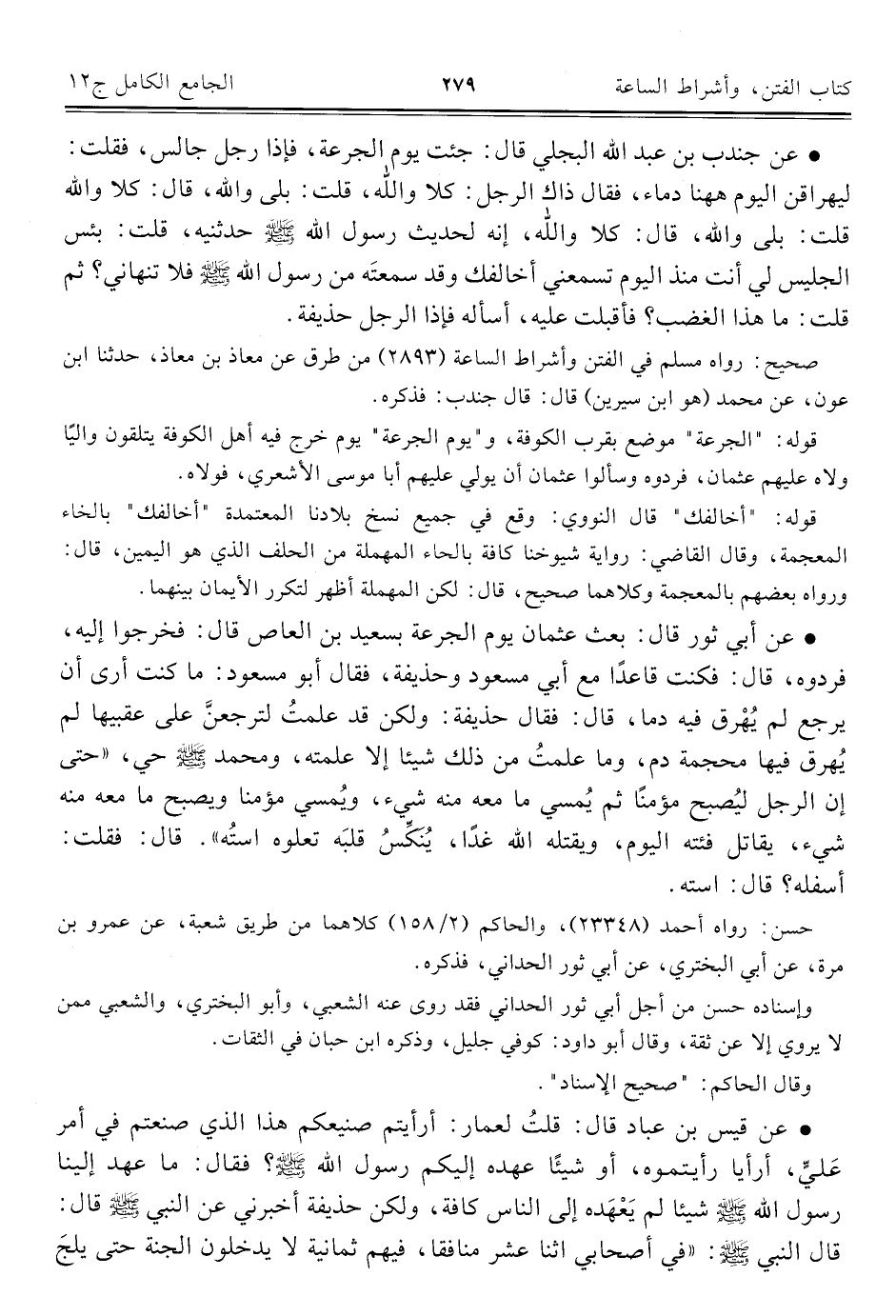 • عن جندب بن عبد اللَّه البجلي قال: جئت يوم الجرعة، فإذا رجل جالس، فقلت: ليهراقن اليوم ههنا دماء، فقال ذاك الرجل: كلا واللَّه، قلت: بلى واللَّه، قال: كلا واللَّه قلت: بلى واللَّه، قال: كلا واللَّه، إنه لحديث رسول اللَّه -صلى اللَّه عليه وسلم- حدثنيه، قلت: بئس الجليس لي أنت منذ اليوم تسمعني أخالفك وقد سمعتَه من رسول اللَّه -صلى اللَّه عليه وسلم- فلا تنهاني؟ ثم قلت: ما هذا الغضب؟ فأقبلت عليه، أسأله فإذا الرجل حذيفة.