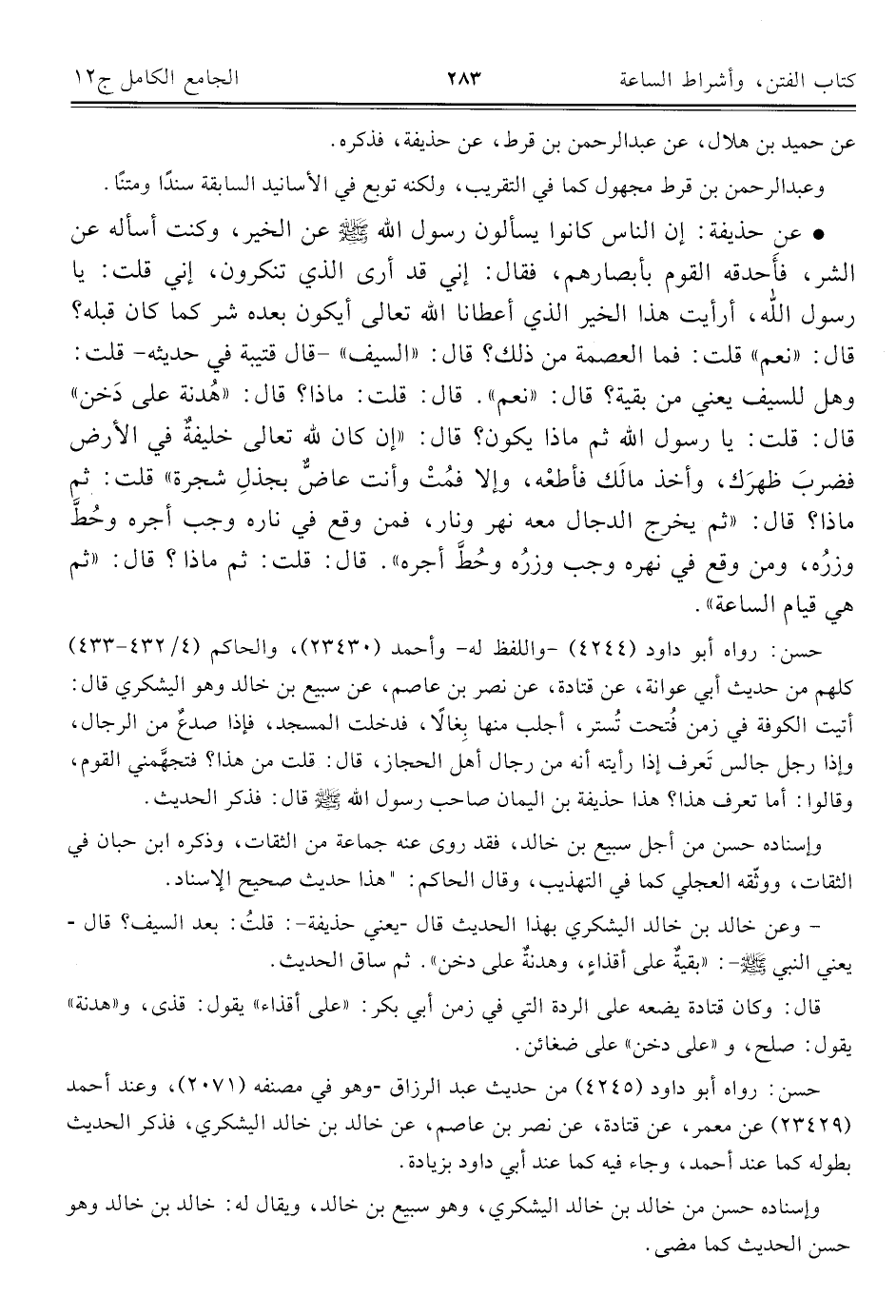 حسن: رواه أبو داود (٤٢٤٤) -واللفظ له- وأحمد (٢٣٤٣٠)، والحاكم (٤/ ٤٣٢ - ٤٣٣) كلهم من حديث أبي عوانة، عن قتادة، عن نصر بن عاصم، عن سبيع بن خالد وهو اليشكري قال: أتيت الكوفة في زمن فُتحت تُستر، أجلب منها بِغالًا، فدخلت المسجد، فإذا صدعٌ من الرجال، وإذا رجل جالس تَعرف إذا رأيته أنه من رجال أهل الحجاز، قال: قلت من هذا؟ فتجهَّمني القوم، وقالوا: أما تعرف هذا؟ هذا حذيفة بن اليمان صاحب رسول اللَّه -صلى اللَّه عليه وسلم- قال: فذكر الحديث.