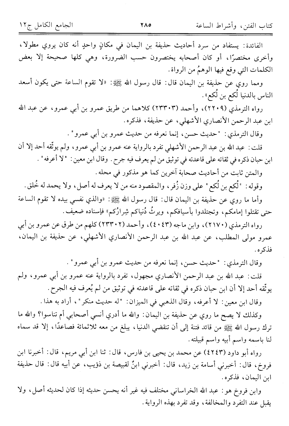 الفائدة: يستفاد من سرد أحاديث حذيفة بن اليمان في مكانٍ واحدٍ أنه كان يروي مطولا، وأخرى مختصرًا، أو كان أصحابه يختصرون حسب الضرورة، وهي كلها صحيحة إلا بعض الكلمات التي وقع فيها الوهمُ من الرواة.