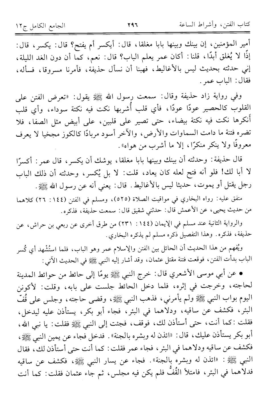 أمير المؤمنين، إن بينك وبينها بابا مغلقا، قال: أيكسر أم يفتح؟ قال: يكسر، قال: إذًا لا يُغلق أبدًا، قلنا: أكان عمر يعلم الباب؟ قال: نعم، كما أن دون الغد الليلة، إني حدثته بحديث ليس بالأغاليط، فهبنا أن نسأل حذيفة، فأمرنا مسروقا، فسأله، فقال: الباب عمر.