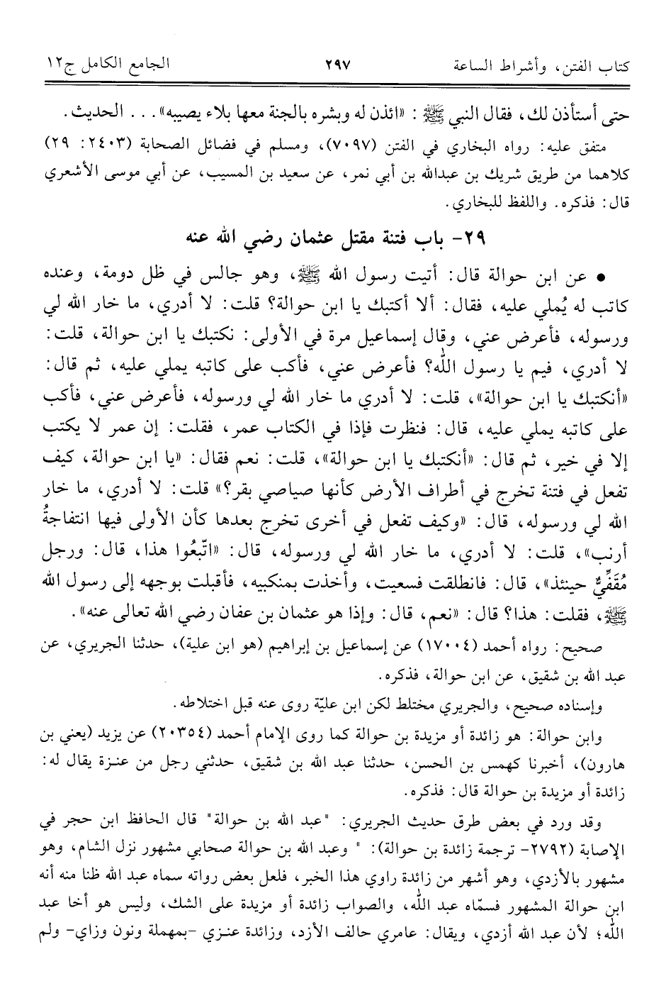 • عن ابن حوالة قال: أتيت رسول اللَّه -صلى اللَّه عليه وسلم-، وهو جالس في ظل دومة، وعنده كاتب له يُملي عليه، فقال: ألا أكتبك يا ابن حوالة؟ قلت: لا أدري، ما خار اللَّه لي ورسوله، فأعرض عني، وقال إسماعيل مرة في الأولى: نكتبك يا ابن حوالة، قلت: لا أدري، فيم يا رسول اللَّه؟ فأعرض عني، فأكب على كاتبه يملي عليه، ثم قال: "أنكتبك يا ابن حوالة"، قلت: لا أدري ما خار اللَّه لي ورسوله، فأعرض عني، فأكب على كاتبه يملي عليه، قال: فنظرت فإذا في الكتاب عمر، فقلت: إن عمر لا يكتب إلا في خير، ثم قال: "أنكتبك يا ابن حوالة"، قلت: نعم فقال: "يا ابن حوالة، كيف تفعل في فتنة تخرج في أطراف الأرض كأنها صياصي بقر؟ " قلت: لا أدري، ما خار اللَّه لي ورسوله، قال: "وكيف تفعل في أخرى تخرج بعدها كأن الأولى فيها انتفاجةُ أرنب"، قلت: لا أدري، ما خار اللَّه لي ورسوله، قال: "اتّبعُوا هذا، قال: ورجل مُقَفِّيٌّ حينئذ"، قال: فانطلقت فسعيت، وأخذت بمنكبيه، فأقبلت بوجهه إلى رسول اللَّه -صلى اللَّه عليه وسلم-، فقلت: هذا؟ قال: "نعم، قال: وإذا هو عثمان بن عفان رضي اللَّه تعالى عنه".