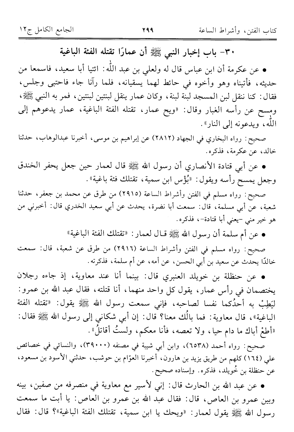 • عن أم سلمة أن رسول اللَّه -صلى اللَّه عليه وسلم- قال لعمار: "تقتلك الفئة الباغية"