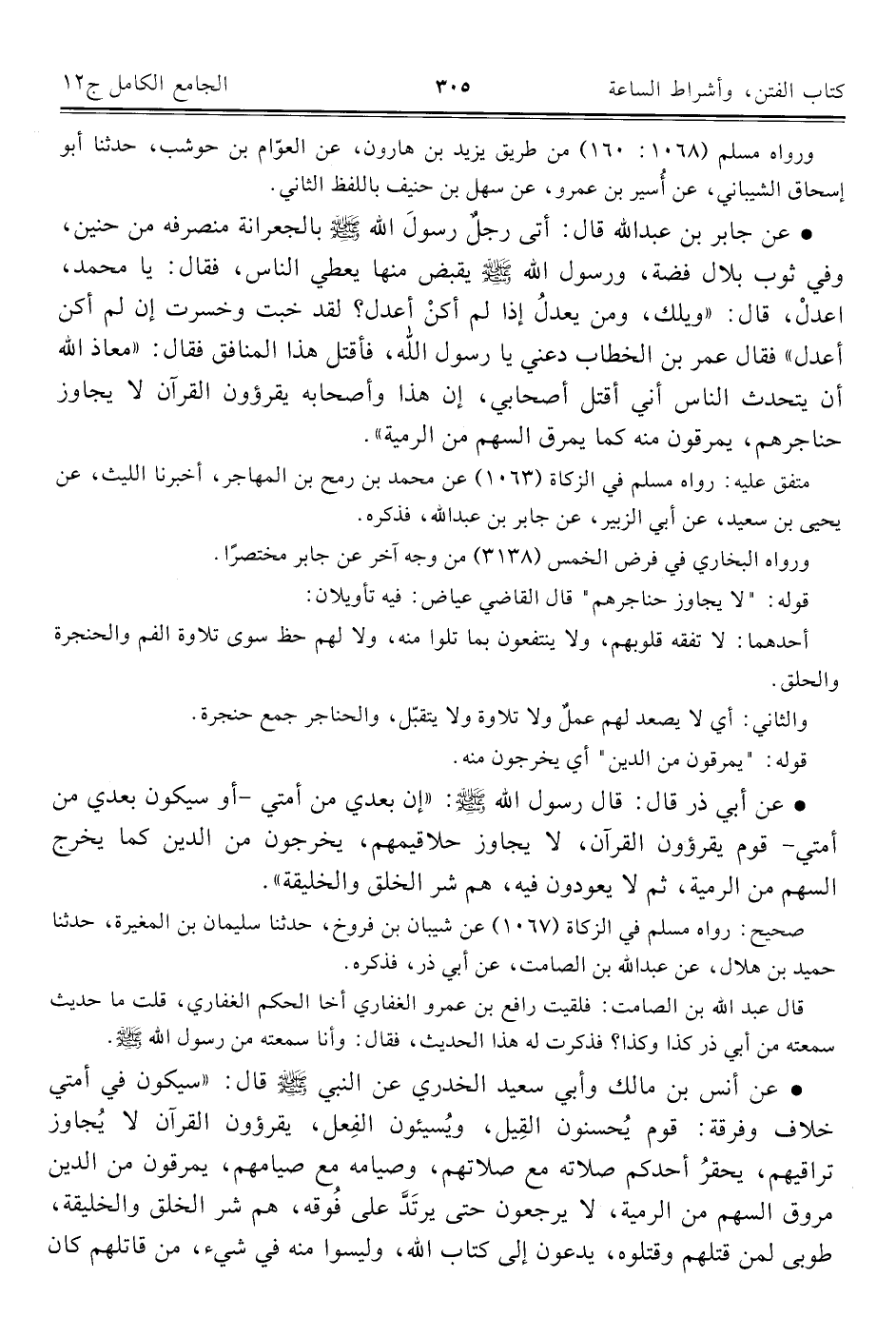 • عن جابر بن عبد اللَّه قال: أتى رجلٌ رسولَ اللَّه -صلى اللَّه عليه وسلم- بالجعرانة منصرفه من حنين، وفي ثوب بلال فضة، ورسول اللَّه -صلى اللَّه عليه وسلم- يقبض منها يعطي الناس، فقال: يا محمد، اعدلْ، قال: "ويلك، ومن يعدلُ إذا لم أكنْ أعدل؟ لقد خبت وخسرت إن لم أكن أعدل" فقال عمر بن الخطاب دعني يا رسول اللَّه، فأقتل هذا المنافق فقال: "معاذ اللَّه أن يتحدث الناس أني أقتل أصحابي، إن هذا وأصحابه يقرؤون القرآن لا يجاوز حناجرهم، يمرقون منه كما يمرق السهم من الرمية".