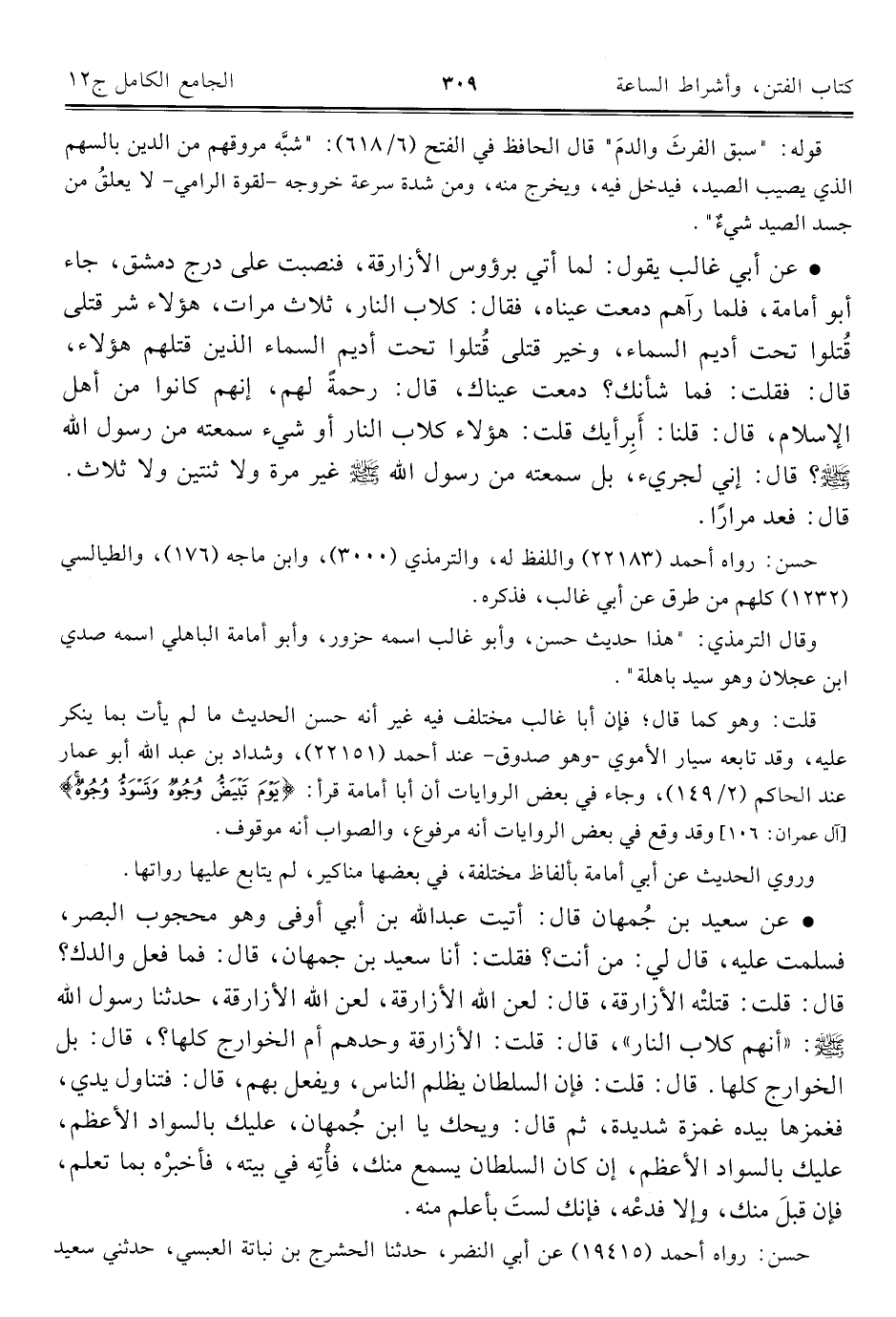 وقال الترمذيّ: "هذا حديث حسن، وأبو غالب اسمه حزور، وأبو أمامة الباهلي اسمه صدي ابن عجلان وهو سيد باهلة".