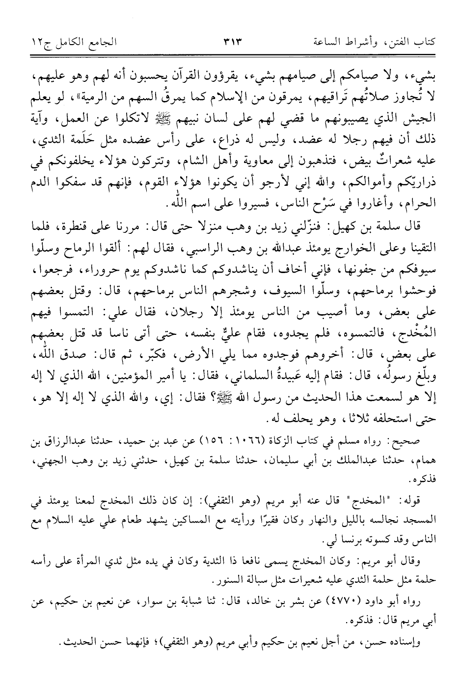 قوله: "المخدج" قال عنه أبو مريم (وهو الثقفي): إن كان ذلك المخدج لمعنا يومئذ في المسجد نجالسه بالليل والنهار وكان فقيرًا ورأيته مع المساكين يشهد طعام علي عليه السلام مع الناس وقد كسوته برنسا لي.