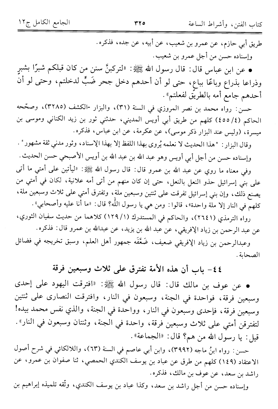 • عن عوف بن مالك قال: قال رسول اللَّه -صلى اللَّه عليه وسلم-: "افترقت اليهود على إحدى وسبعين فرقة، فواحدة في الجنة، وسبعون في النار، وافترقت النصارى على ثنتين وسبعين فرقة، فإحدى وسبعون في النار، وواحدة في الجنة، والذي نفس محمد بيده! لتفترقن أمتي على ثلاث وسبعين فرقة، واحدة في الجنة، وثنتان وسبعون في النار". قيل: يا رسول اللَّه من هم؟ قال: "الجماعة".