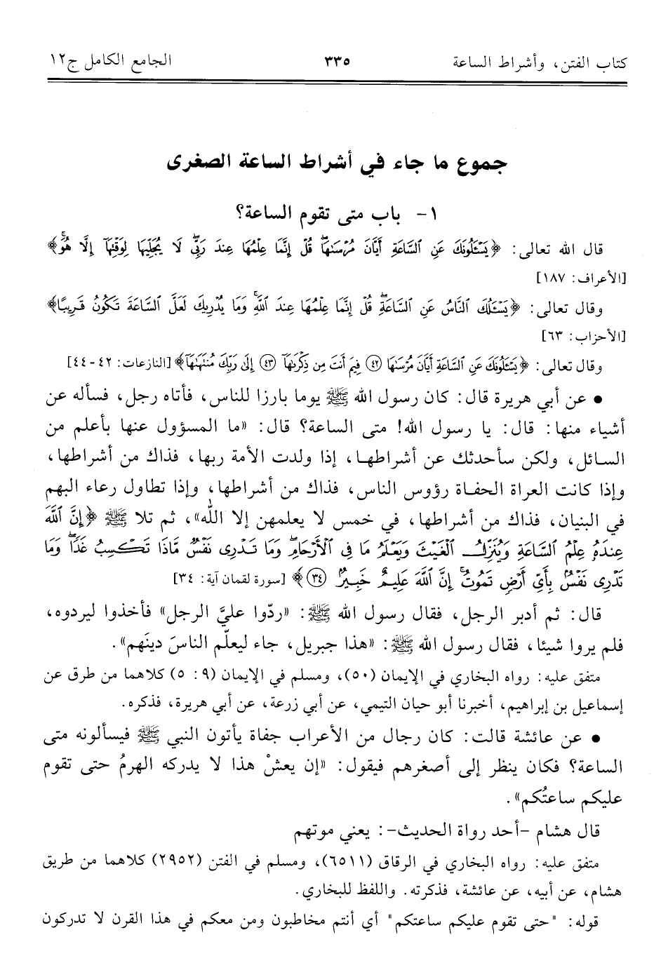 • عن أبي هريرة قال: كان رسول اللَّه -صلى اللَّه عليه وسلم- يوما بارزا للناس، فأتاه رجل، فسأله عن أشياء منها: قال: يا رسول اللَّه! متى الساعة؟ قال: "ما المسؤول عنها بأعلم من السائل، ولكن سأحدثك عن أشراطها، إذا ولدت الأمة ربها، فذاك من أشراطها، وإذا كانت العراة الحفاة رؤوس الناس، فذاك من أشراطها، وإذا تطاول رعاء البهم في البنيان، فذاك من أشراطها، في خمس لا يعلمهن إلا اللَّه"، ثم تلا -صلى اللَّه عليه وسلم- {إِنَّ اللَّهَ عِنْدَهُ عِلْمُ السَّاعَةِ وَيُنَزِّلُ الْغَيْثَ وَيَعْلَمُ مَا فِي الْأَرْحَامِ وَمَا تَدْرِي نَفْسٌ مَاذَا تَكْسِبُ غَدًا وَمَا تَدْرِي نَفْسٌ بِأَيِّ أَرْضٍ تَمُوتُ إِنَّ اللَّهَ عَلِيمٌ خَبِيرٌ (٣٤)} [سورة لقمان آية: ٣٤].