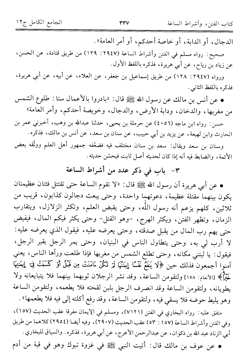 • عن أبي هريرة أن رسول اللَّه -صلى اللَّه عليه وسلم- قال: "لا تقوم الساعة حتى تقتتل فئتان عظيمتان يكون بينهما مقتلة عظيمة، دعوتهما واحدة، وحتى يبعث دجالون كذابون، قريب من ثلاثين، كلهم يزعم أنه رسول اللَّه، وحتى يقبض العلم، وتكثر الزلازل، ويتقارب الزمان، وتظهر الفتن، ويكثر الهرج، -وهو القتل- وحتى يكثر فيكم المال، فيفيض حتى يهم رب المال من يقبل صدقته، وحتى يعرضه عليه، فيقول الذي يعرضه عليه: لا أرب لي به، وحتى يتطاول الناس في البنيان، وحتى يمر الرجل بقبر الرجل، فيقول: يا ليتني مكانه، وحتى تطلع الشمس من مغربها فإذا طلعت ورآها الناس، يعني آمنوا أجمعون فذلك حين {لَا يَنْفَعُ نَفْسًا إِيمَانُهَا لَمْ تَكُنْ آمَنَتْ مِنْ قَبْلُ أَوْ كَسَبَتْ فِي إِيمَانِهَا خَيْرًا} [الأنعام: ١٥٨] ولتقومن الساعة، وقد نشر الرجلان ثوبهما بينهما فلا يتبايعانه ولا يطويانه، ولتقومن الساعة وقد انصرف الرجل بلبن لقحته فلا يطعمه، ولتقومن الساعة وهو يليط حوضه فلا يسقي فيه، ولتقومن الساعة، وقد رفع أكلته إلى فيه فلا يطعمها".