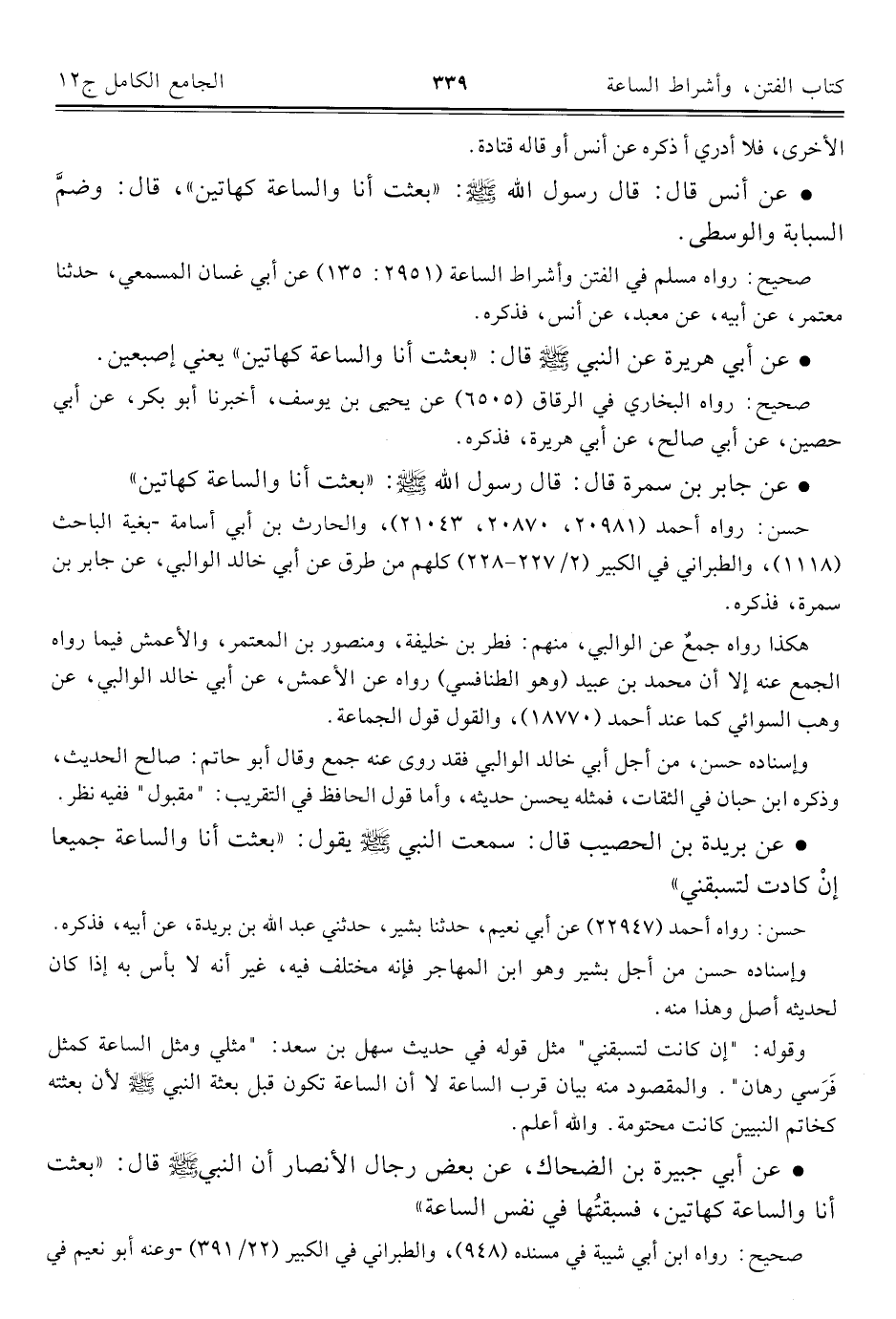 • عن جابر بن سمرة قال: قال رسول اللَّه -صلى اللَّه عليه وسلم-: "بعثت أنا والساعة كهاتين"