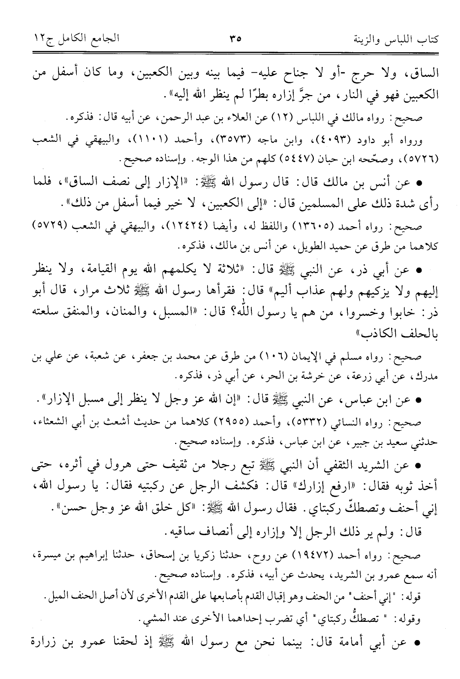 • عن أنس بن مالك قال: قال رسول اللَّه -صلى اللَّه عليه وسلم-: "الإزار إلى نصف الساق"، فلما رأى شدة ذلك على المسلمين قال: "إلى الكعبين، لا خير فيما أسفل من ذلك".