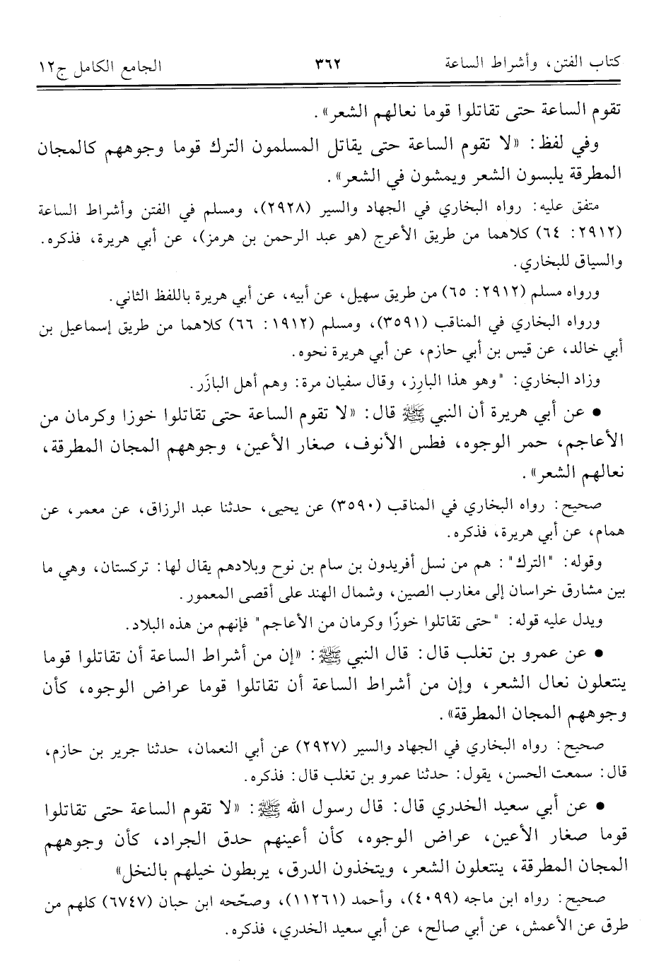 وفي لفظ: "لا تقوم الساعة حتى يقاتل المسلمون الترك قوما وجوههم كالمجان المطرقة يلبسون الشعر ويمشون في الشعر".