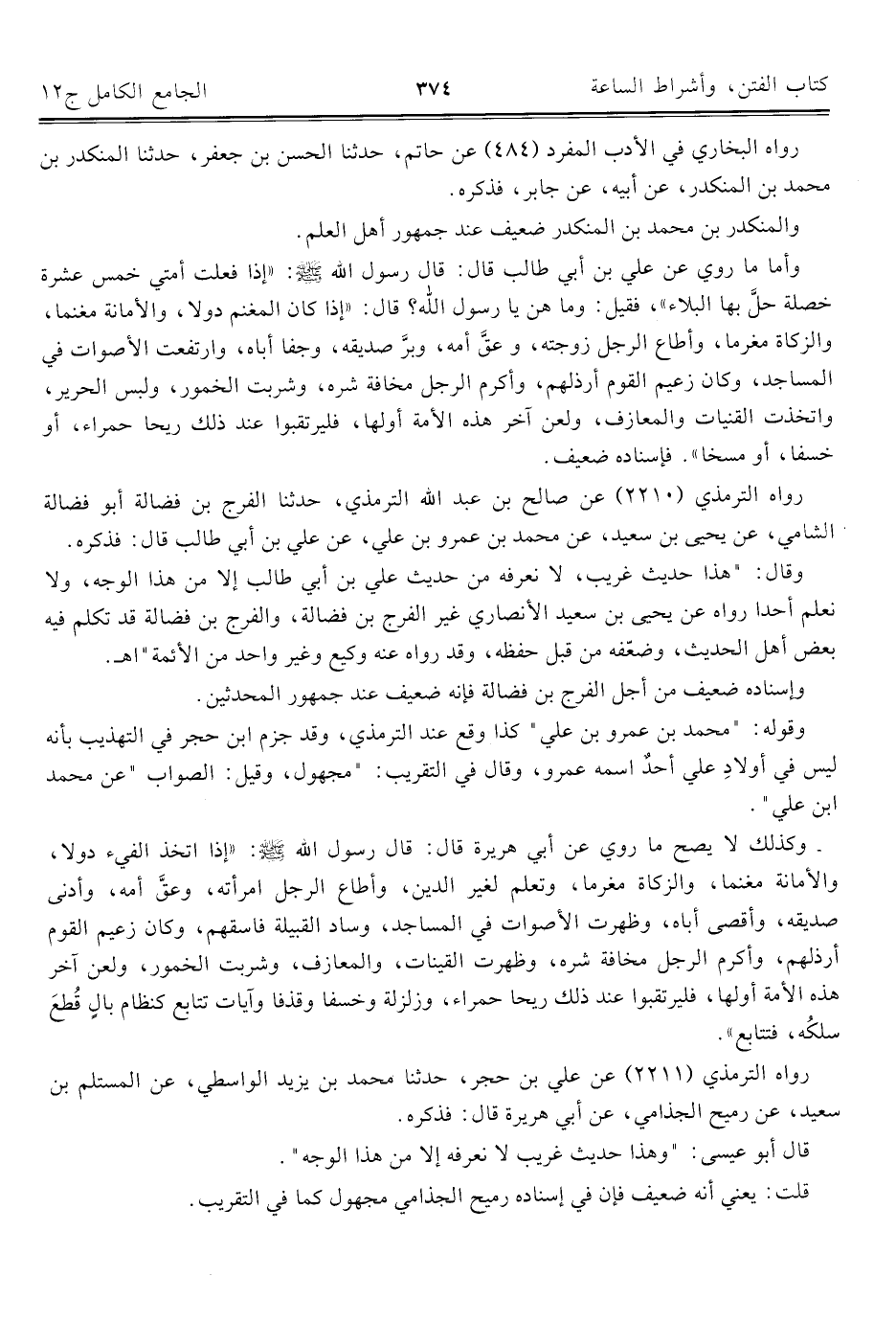 وكذلك لا يصح ما روي عن أبي هريرة قال: قال رسول اللَّه -صلى اللَّه عليه وسلم-: "إذا اتخذ الفيء دولا، والأمانة مغنما، والزكاة مغرما، وتعلم لغير الدين، وأطاع الرجل امرأته، وعقَّ أمه، وأدنى صديقه، وأقصى أباه، وظهرت الأصوات في المساجد، وساد القبيلة فاسقهم، وكان زعيم القوم أرذلهم، وأكرم الرجل مخافة شره، وظهرت القينات، والمعازف، وشربت الخمور، ولعن آخر هذه الأمة أولها، فليرتقبوا عند ذلك ريحا حمراء، وزلزلة وخسفا وقذفا وآيات تتابع كنظام بالٍ قُطعَ سلكُه، فتتابع".