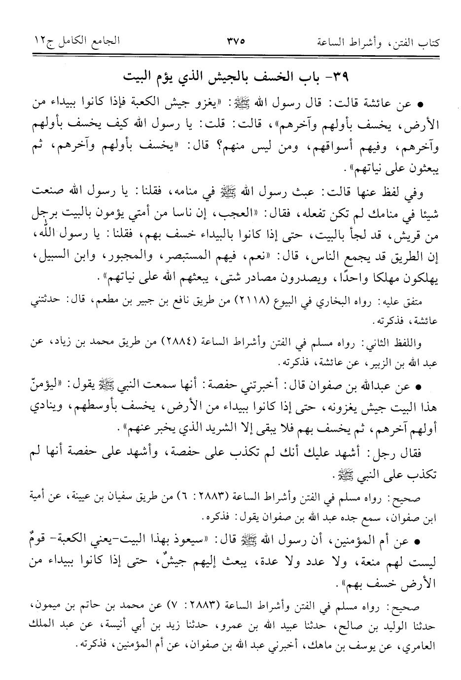 • عن عائشة قالت: قال رسول اللَّه -صلى اللَّه عليه وسلم-: "يغزو جيش الكعبة فإذا كانوا ببيداء من الأرض، يخسف بأولهم وآخرهم"، قالت: قلت: يا رسول اللَّه كيف يخسف بأولهم وآخرهم، وفيهم أسواقهم، ومن ليس منهم؟ قال: "يخسف بأولهم وآخرهم، ثم يبعثون على نياتهم".
