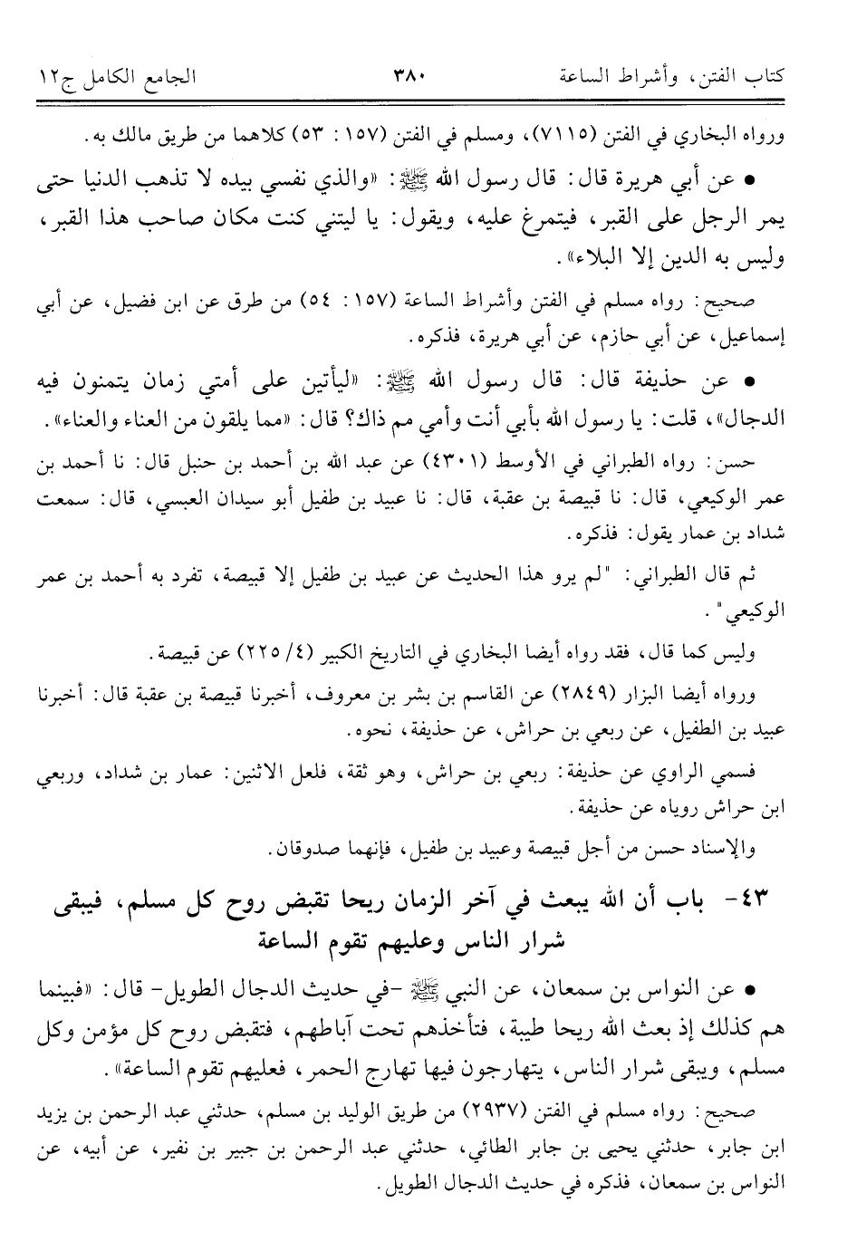 ٤٣ - باب أن اللَّه يبعث في آخر الزمان ريحا تقبض روح كل مسلم، فيبقى شرار الناس وعليهم تقوم الساعة