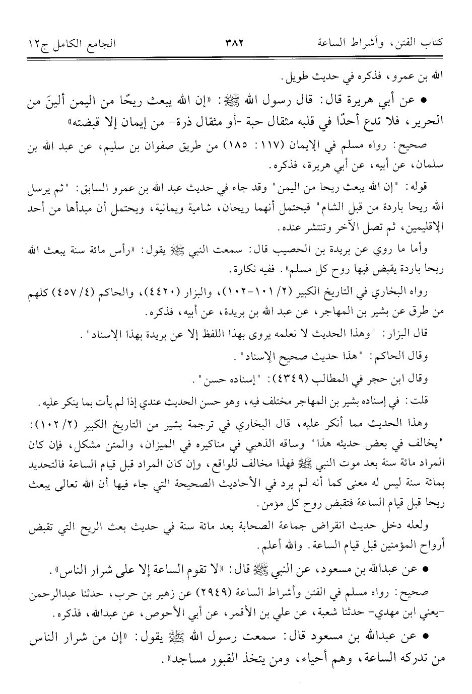وأما ما روي عن بريدة بن الحصيب قال: سمعت النبي -صلى اللَّه عليه وسلم- يقول: "رأس مائة سنة يبعث اللَّه ريحا باردة يقبض فيها روح كل مسلم". ففيه نكارة.
