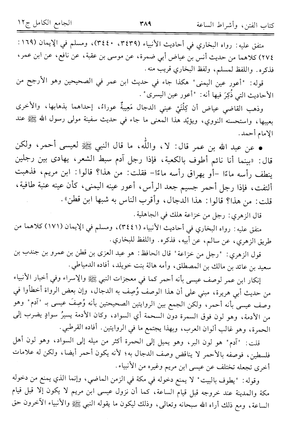 • عن عبد اللَّه بن عمر قال: لا، واللَّه، ما قال النبي -صلى اللَّه عليه وسلم- لعيسى أحمر، ولكن قال: "بينما أنا نائم أطوف بالكعبة، فإذا رجل آدم سبط الشعر، يهادى بين رجلين ينطف رأسه ماءًا -أو يهراق رأسه ماءًا- فقلت: من هذا؟ قالوا: ابن مريم، فذهبت ألتفت، فإذا رجل أحمر جسيم جعد الرأس، أعور عينه اليمنى، كأن عينه عنبة طافية، قلت: من هذا؟ قالوا: هذا الدجال، وأقرب الناس به شبها ابن قطن".