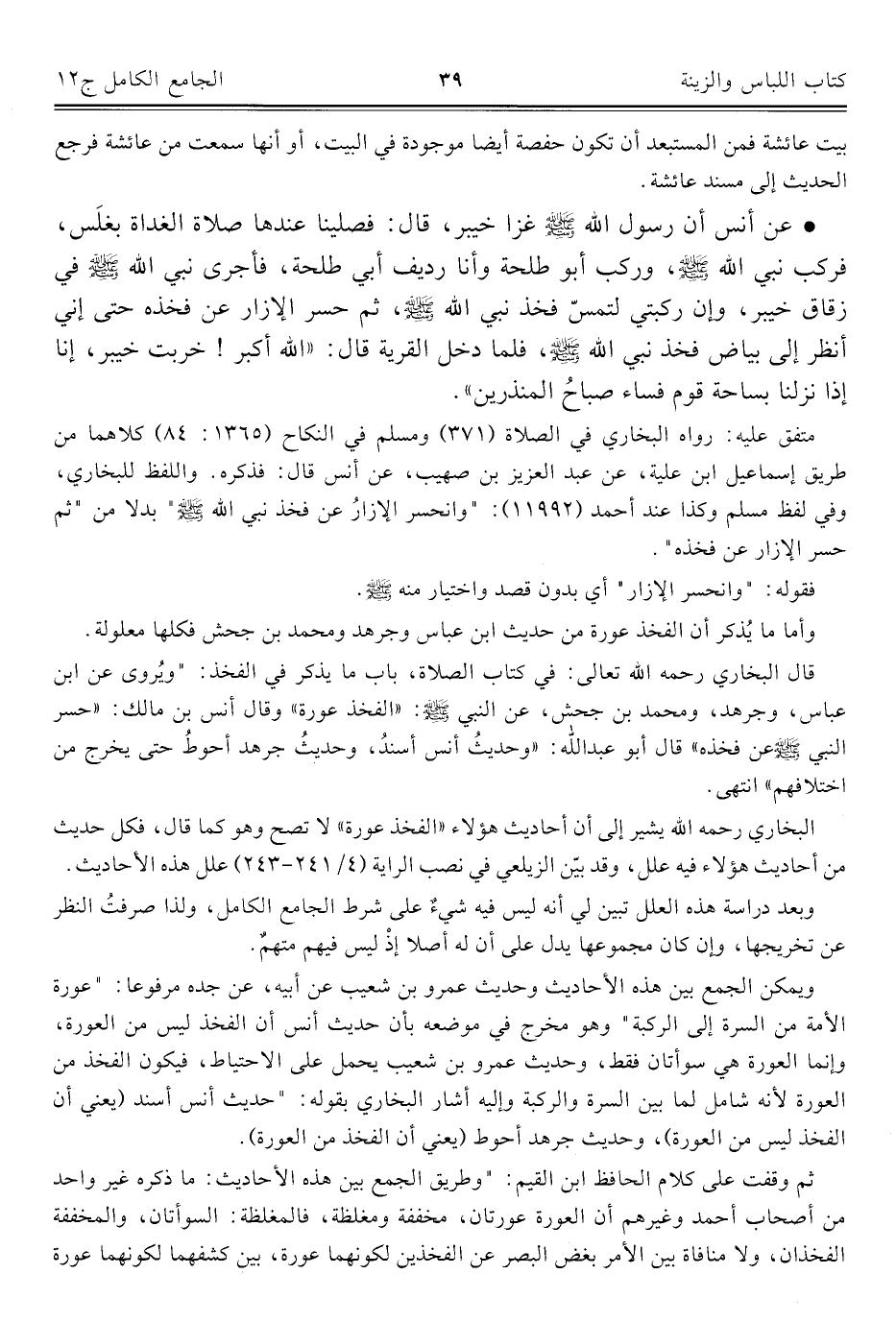 قال البخاري رحمه اللَّه تعالى: في كتاب الصلاة، باب ما يذكر في الفخذ: "ويُروى عن ابن عباس، وجرهد، ومحمد بن جحش، عن النبي -صلى اللَّه عليه وسلم-: "الفخذ عورة" وقال أنس بن مالك: "حسر النبي -صلى اللَّه عليه وسلم- عن فخذه" قال أبو عبد اللَّه: "وحديثُ أنس أسندُ، وحديثُ جرهد أحوطُ حتى يخرج من اختلافهم" انتهى.