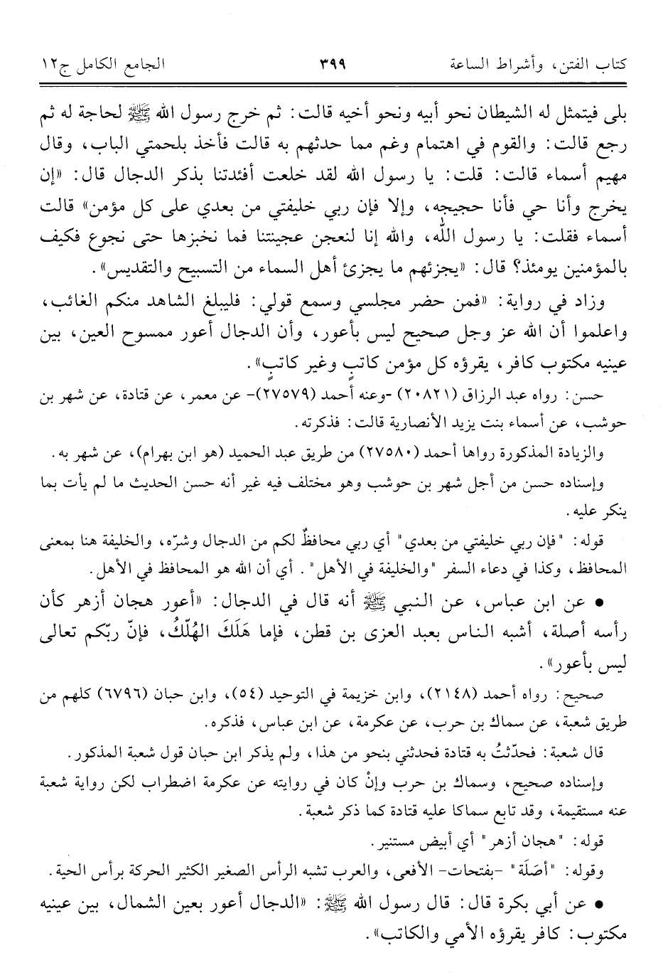 • عن أبي بكرة قال: قال رسول اللَّه -صلى اللَّه عليه وسلم-: "الدجال أعور بعين الشمال، بين عينيه مكتوب: كافر يقرؤه الأمي والكاتب".