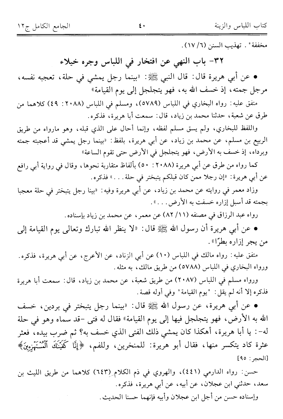 • عن أبي هريرة قال: قال النبي -صلى اللَّه عليه وسلم-: "بينما رجل يمشي في حلة، تعجبه نفسه، مرجل جمته، إذ خسف اللَّه به، فهو يتجلجل إلى يوم القيامة"