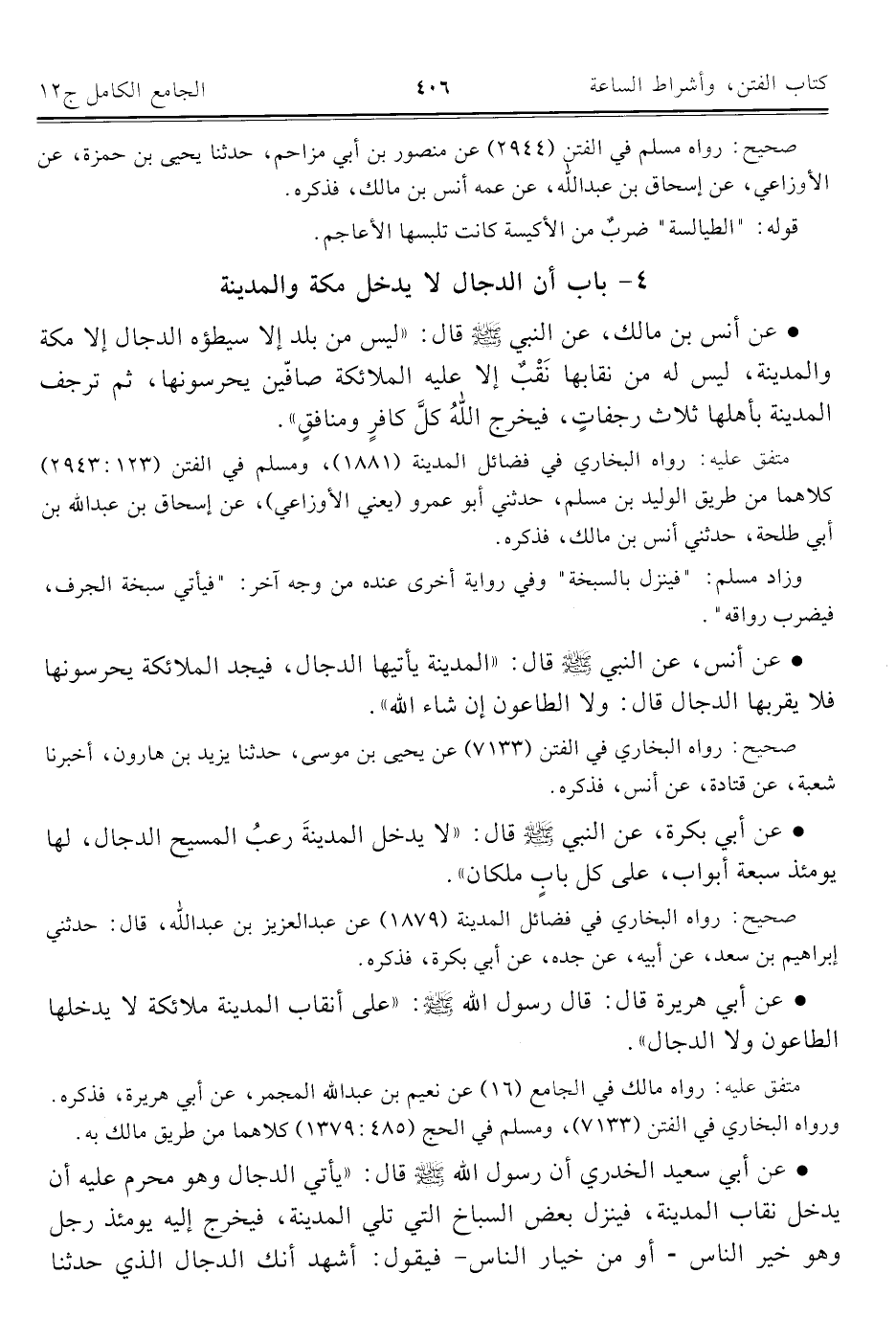 • عن أبي سعيد الخدري أن رسول اللَّه -صلى اللَّه عليه وسلم- قال: "يأتي الدجال وهو محرم عليه أن يدخل نقاب المدينة، فينزل بعض السباخ التي تلي المدينة، فيخرج إليه يومئذ رجل وهو خير الناس -أو من خيار الناس- فيقول: أشهد أنك الدجال الذي حدّثنا