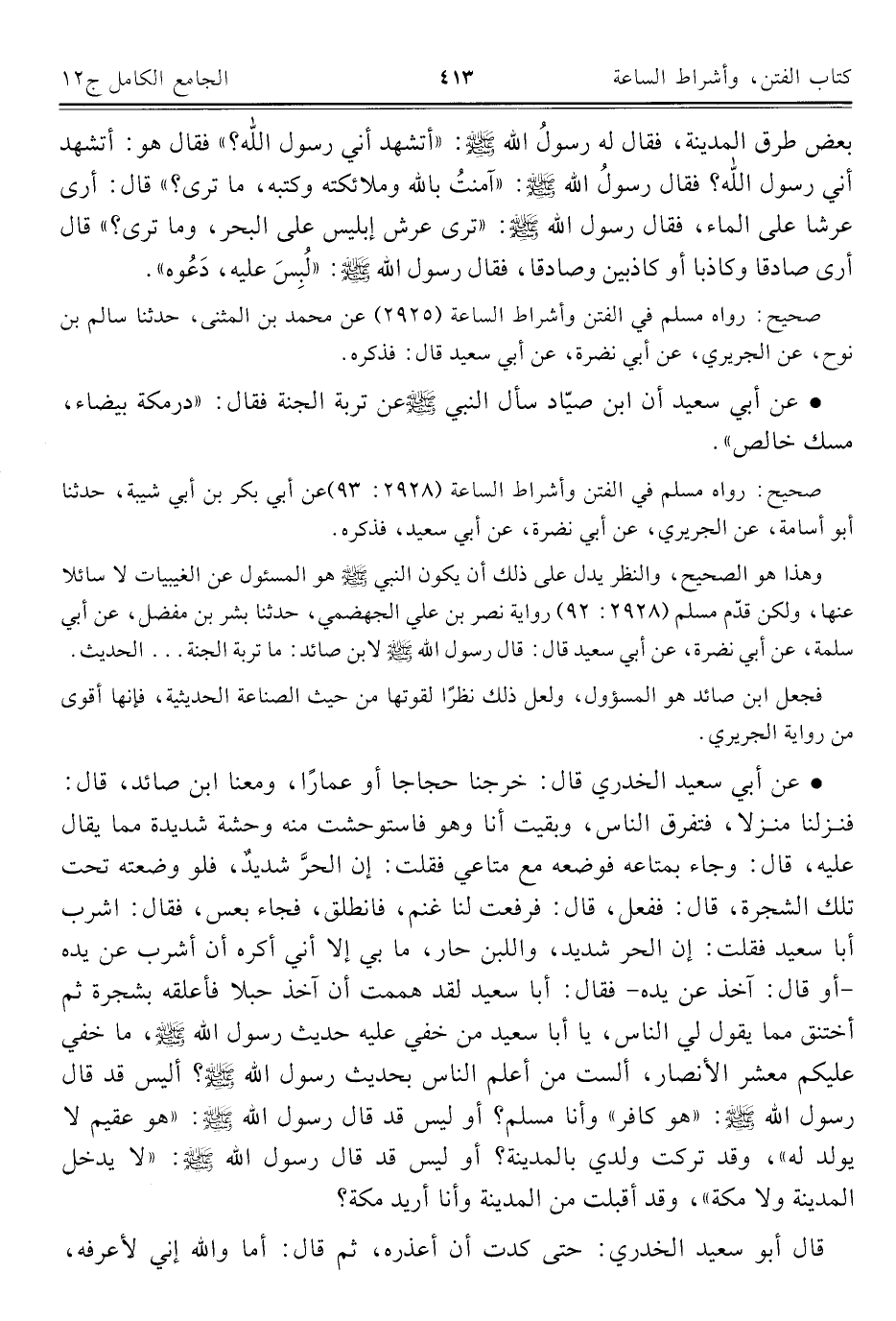 وهذا هو الصحيح، والنظر يدل على ذلك أن يكون النبي -صلى اللَّه عليه وسلم- هو المسئول عن الغيبيات لا سائلا عنها، ولكن قدّم مسلم (٢٩٢٨: ٩٢) رواية نصر بن علي الجهضمي، حدّثنا بشر بن مفضل، عن أبي سلمة، عن أبي نضرة، عن أبي سعيد قال: قال رسول اللَّه -صلى اللَّه عليه وسلم- لابن صائد: ما تربة الجنة. . . الحديث.