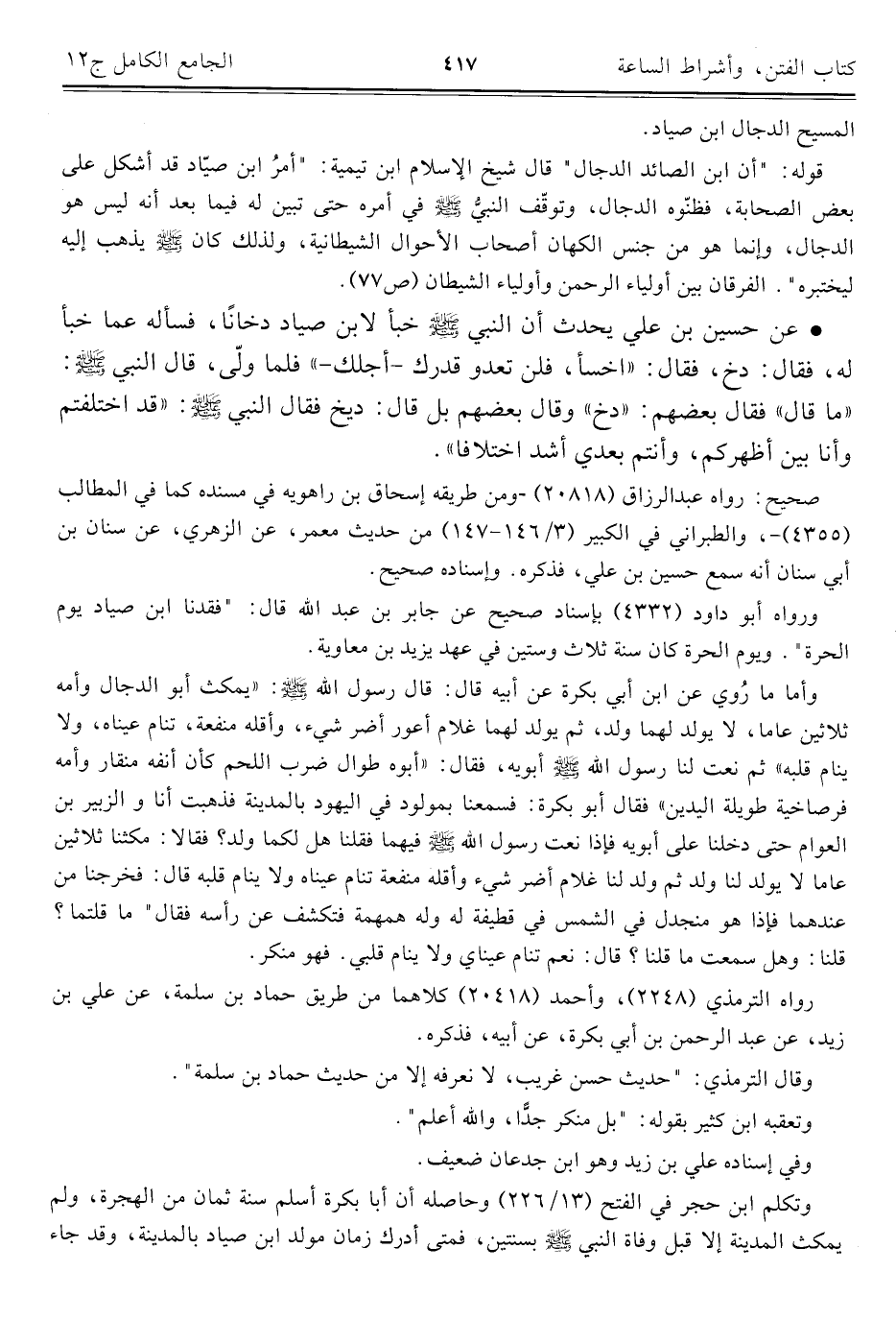 وتكلم ابن حجر في الفتح (١٣/ ٢٢٦) وحاصله أن أبا بكرة أسلم سنة ثمان من الهجرة، ولم يمكث المدينة إلا قبل وفاة النبي -صلى اللَّه عليه وسلم- بسنتين، فمتى أدرك زمان مولد ابن صياد بالمدينة، وقد جاء