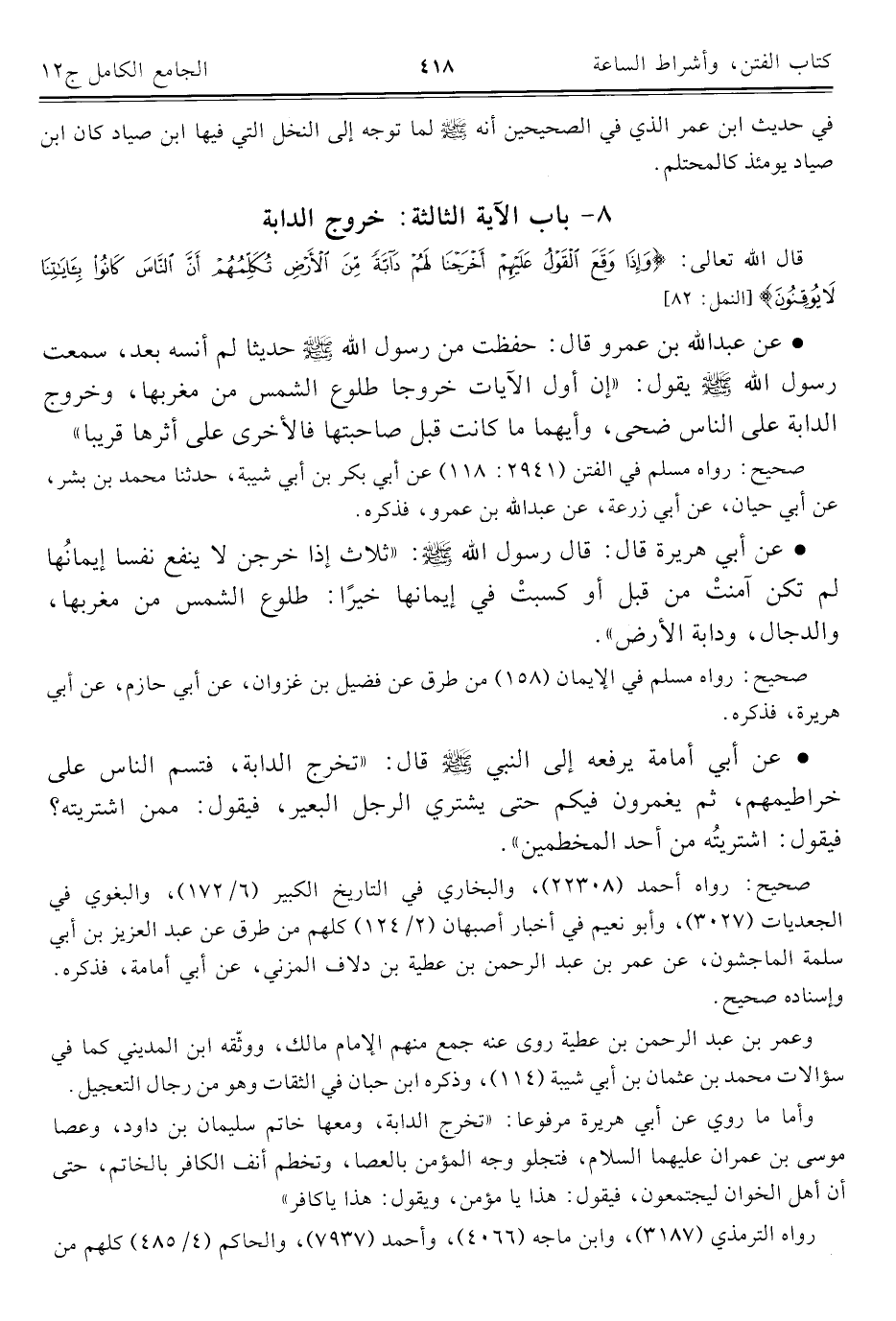 • عن أبي أمامة يرفعه إلى النبي -صلى اللَّه عليه وسلم- قال: "تخرج الدابة، فتسم الناس على خراطيمهم، ثم يغمرون فيكم حتى يشتري الرجل البعير، فيقول: ممن اشتريته؟ فيقول: اشتريتُه من أحد المخطمين".