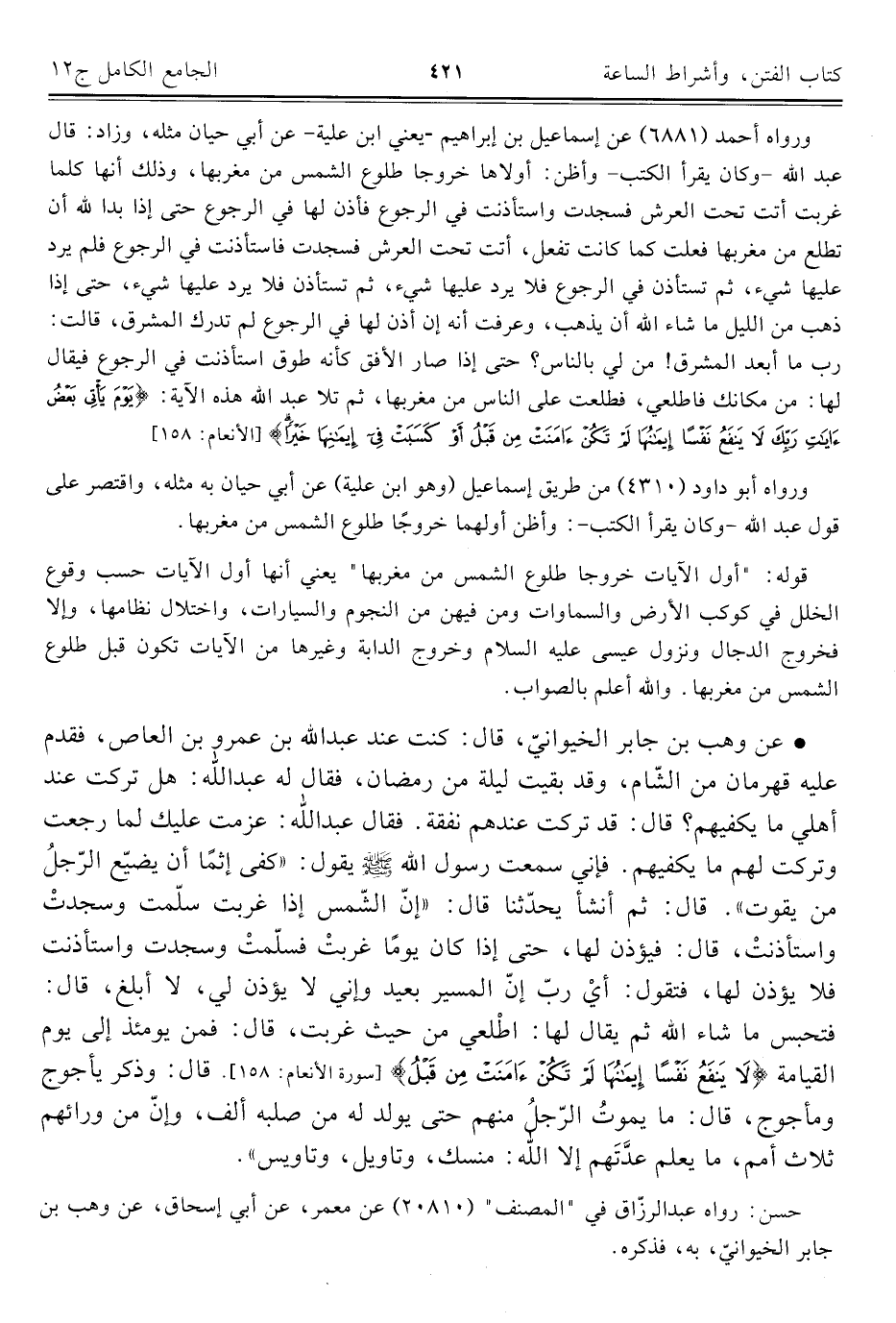 ورواه أحمد (٦٨٨١) عن إسماعيل بن إبراهيم -يعني ابن علية- عن أبي حيان مثله، وزاد: قال عبد اللَّه -وكان يقرأ الكتب- وأظن: أولاها خروجا طلوع الشمس من مغربها، وذلك أنها كلما غربت أتت تحت العرش فسجدت واستأذنت في الرجوع فأذن لها في الرجوع حتى إذا بدا للَّه أن تطلع من مغربها فعلت كما كانت تفعل، أتت تحت العرش فسجدت فاستأذنت في الرجوع فلم يرد عليها شيء، ثم تستأذن في الرجوع فلا يرد عليها شيء، ثم تستأذن فلا يرد عليها شيء، حتى إذا ذهب من الليل ما شاء اللَّه أن يذهب، وعرفت أنه إن أذن لها في الرجوع لم تدرك المشرق، قالت: رب ما أبعد المشرق! من لي بالناس؟ حتى إذا صار الأفق كأنه طوق استأذنت في الرجوع فيقال لها: من مكانك فاطلعي، فطلعت على الناس من مغربها، ثم تلا عبد اللَّه هذه الآية: {يَوْمَ يَأْتِي بَعْضُ آيَاتِ رَبِّكَ لَا يَنْفَعُ نَفْسًا إِيمَانُهَا لَمْ تَكُنْ آمَنَتْ مِنْ قَبْلُ أَوْ كَسَبَتْ فِي إِيمَانِهَا خَيْرًا} [الأنعام: ١٥٨]