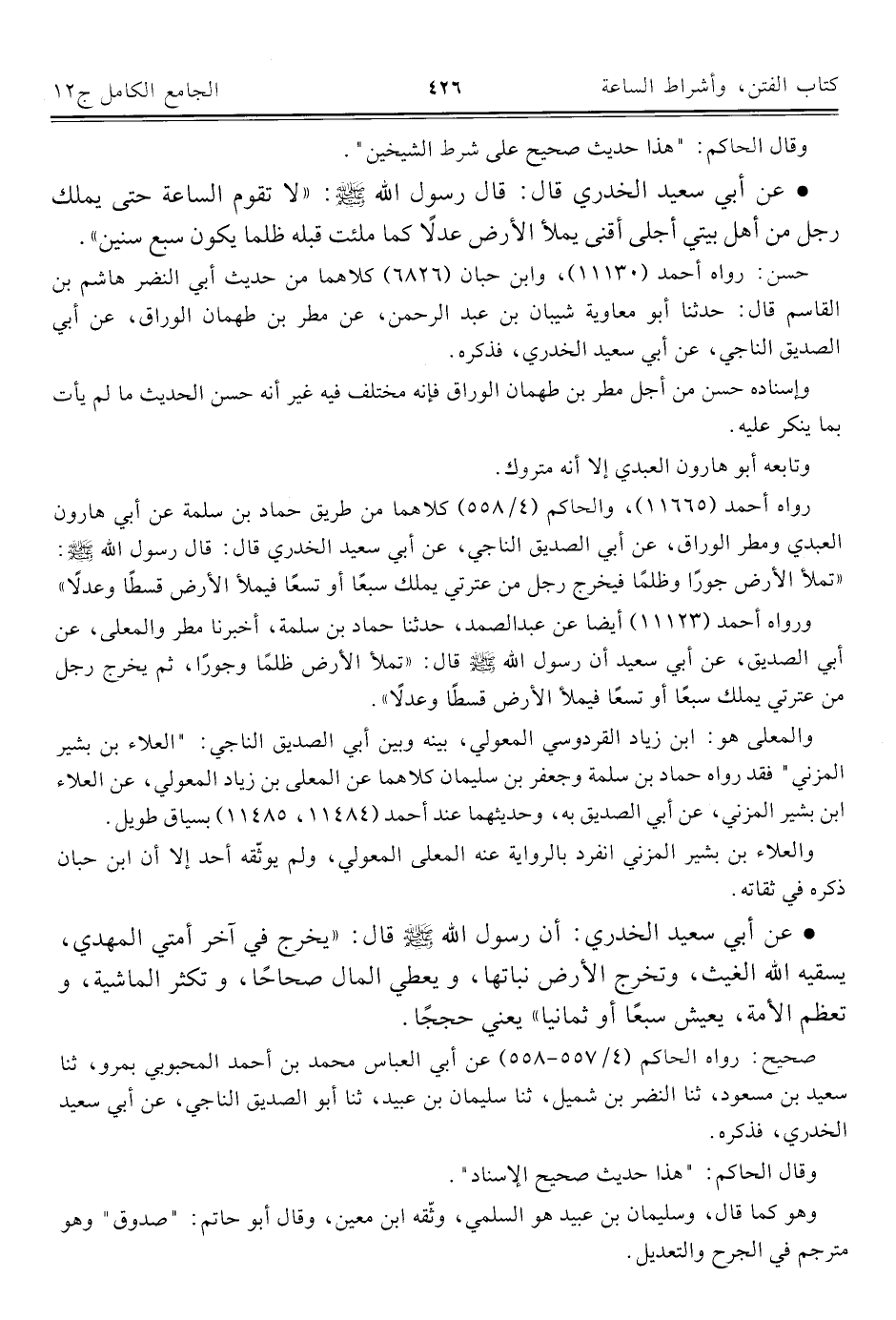 ورواه أحمد (١١١٢٣) أيضًا عن عبد الصمد، حدّثنا حماد بن سلمة، أخبرنا مطر والمعلى، عن أبي الصديق، عن أبي سعيد أن رسول اللَّه -صلى اللَّه عليه وسلم- قال: "تملأ الأرض ظلمًا وجورًا، ثم يخرج رجل من عترتي يملك سبعًا أو تسعًا فيملأ الأرض قسطًا وعدلًا".