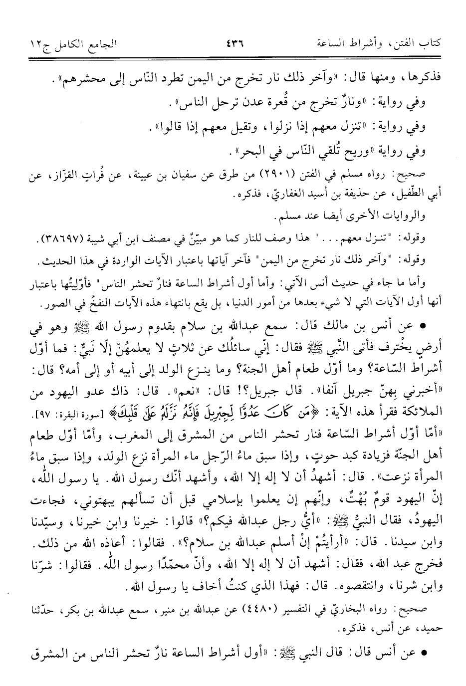 • عن أنس بن مالك قال: سمع عبد اللَّه بن سلام بقدوم رسول اللَّه -صلى اللَّه عليه وسلم- وهو في أرضٍ يخْترف فأتى النَّبي -صلى اللَّه عليه وسلم- فقال: إنّي سائلُك عن ثلاثٍ لا يعلمهُنّ إلّا نَبيٌّ: فما أوّل أشراط السّاعة؟ وما أوّل طعام أهل الجنة؟ وما ينزع الولد إلى أبيه أو إلى أمه؟ قال: "أخبرني بِهنّ جبريل آنفا". قال جبريل؟ ! قال: "نعم". قال: ذاك عدو اليهود من الملائكة فقرأ هذه الآية: {مَنْ كَانَ عَدُوًّا لِجِبْرِيلَ فَإِنَّهُ نَزَّلَهُ عَلَى قَلْبِكَ} [سورة البقرة: ٩٧]. "أمّا أوّل أشراط السّاعة فنار تحشر الناس من المشرق إلى المغرب، وأما أوّل طعام أهل الجنّة فزيادة كبد حوتٍ، وإذا سبق ماءُ الرّجل ماء المرأة نزع الولد، وإذا سبق ماءُ المرأة نزعت". قال: أشهدُ أن لا إله إلا اللَّه، وأشهد أنّك رسول اللَّه. يا رسول اللَّه، إنّ اليهود قومٌ بُهْتٌ، وإنّهم إن يعلموا بإسلامي قبل أن تسألهم يبهتوني، فجاءت اليهودُ، فقال النبيُّ -صلى اللَّه عليه وسلم-: "أيُّ رجل عبد اللَّه فيكم؟ " قالوا: خيرنا وابن خيرنا، وسيّدنا وابن سيدنا. قال: "أرأيتُمْ إنْ أسلم عبد اللَّه بن سلام؟ ". فقالوا: أعاذه اللَّه من ذلك. فخرج عبد اللَّه، فقال: أشهد أن لا إله إلا اللَّه، وأنّ محمّدًا رسول اللَّه. فقالوا: شرّنا وابن شرنا، وانتقصوه. قال: فهذا الذي كنتُ أخاف يا رسول اللَّه.